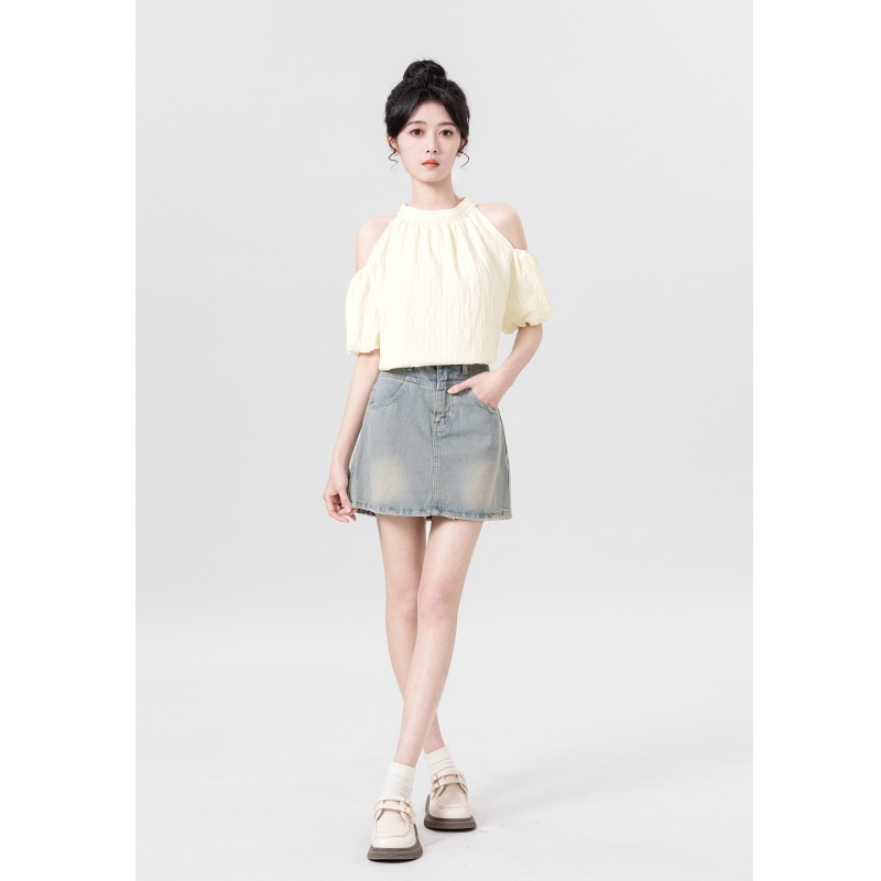 杏色挂脖绑带短袖衬衫女夏2025新款设计感法式泡泡袖衬衣露肩上衣