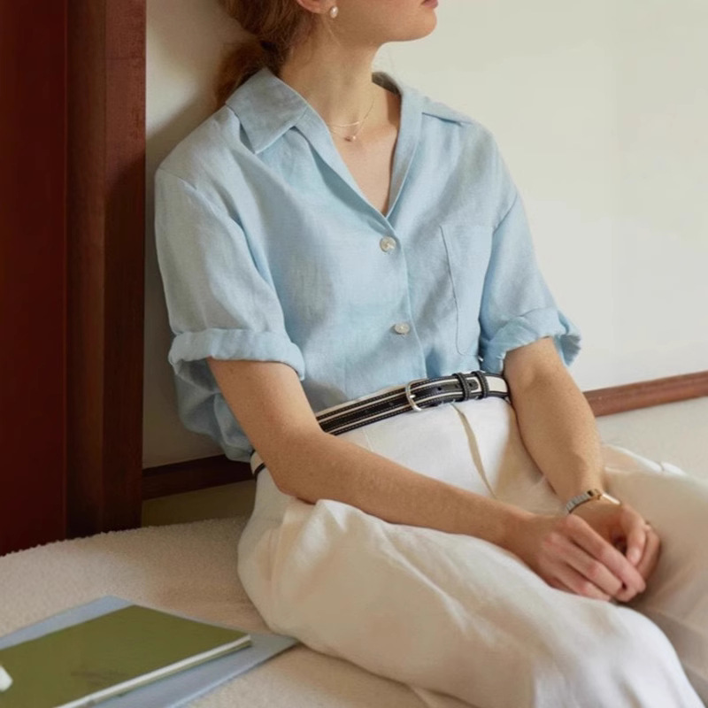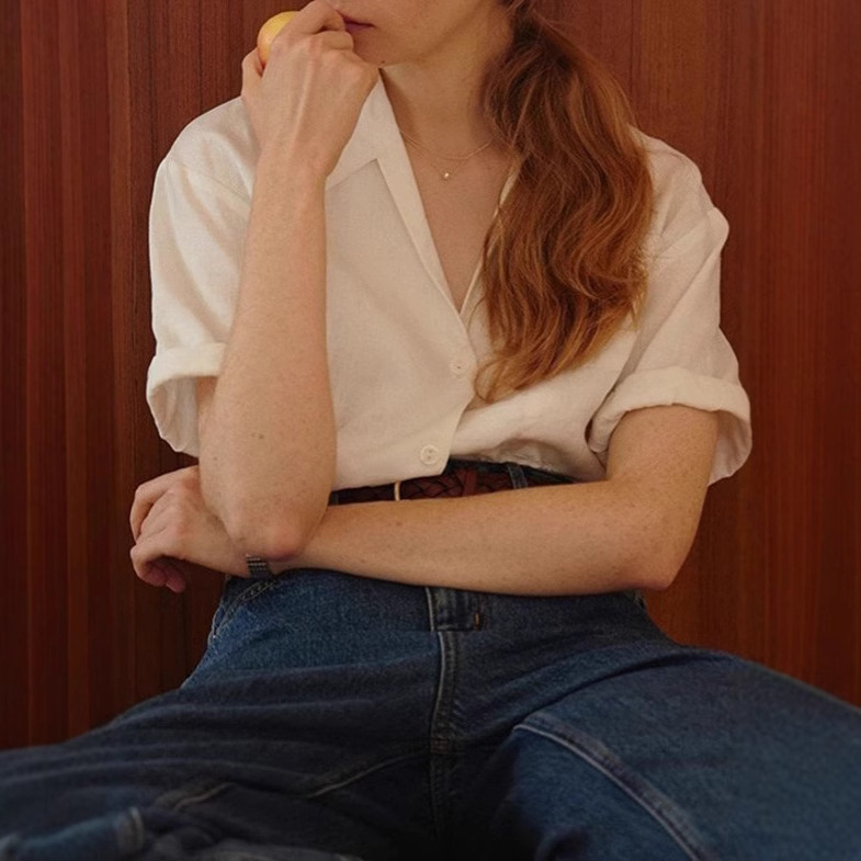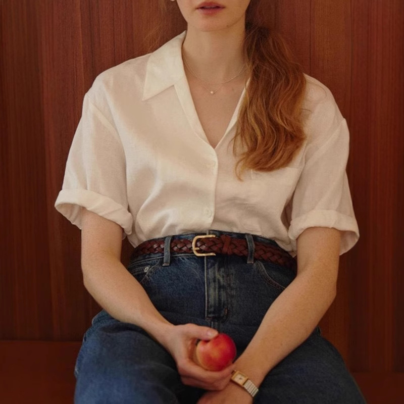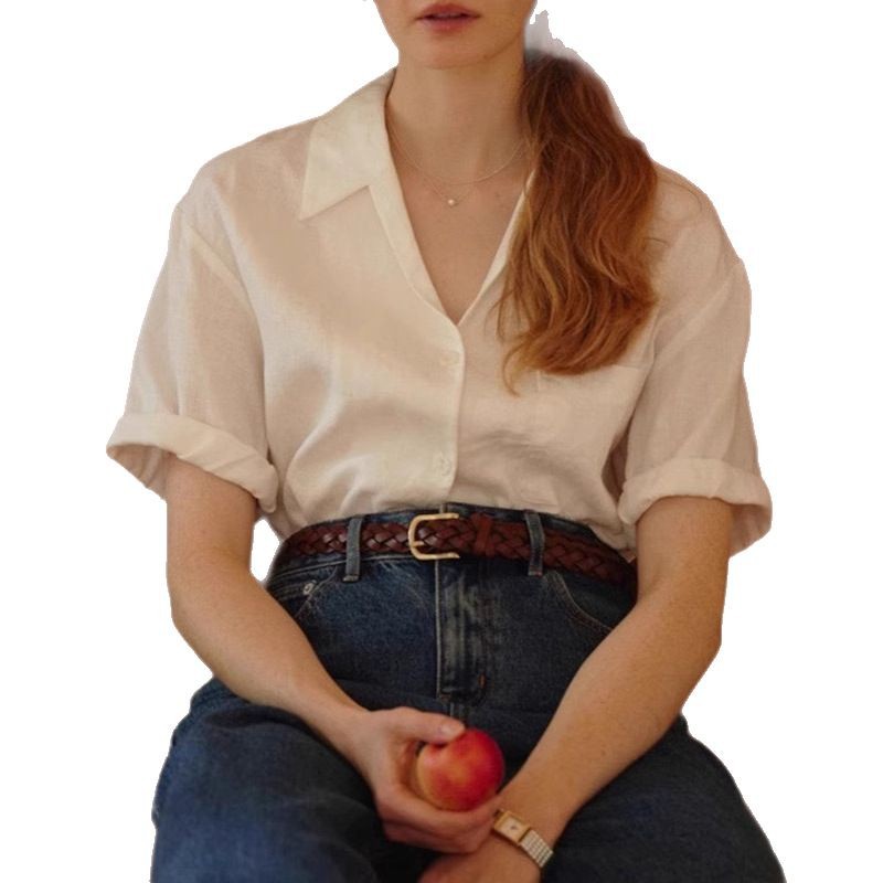 法式亚麻卷边袖深V短袖衬衫 两色舒适气质女夏季新款