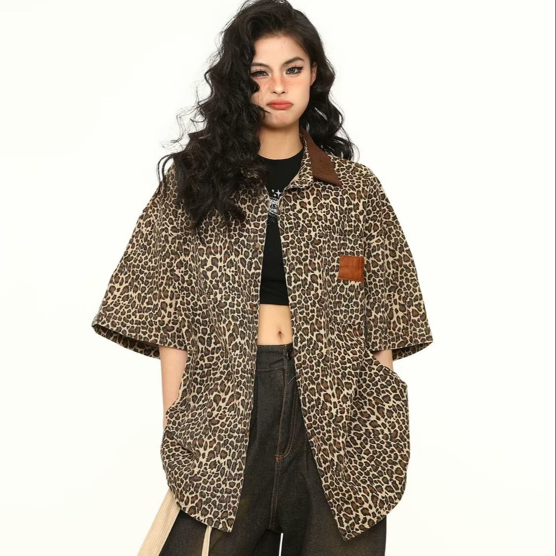 韩系夏季穿搭棕色豹纹短袖衬衫洋气高端别致上衣宽松欧货小衫
