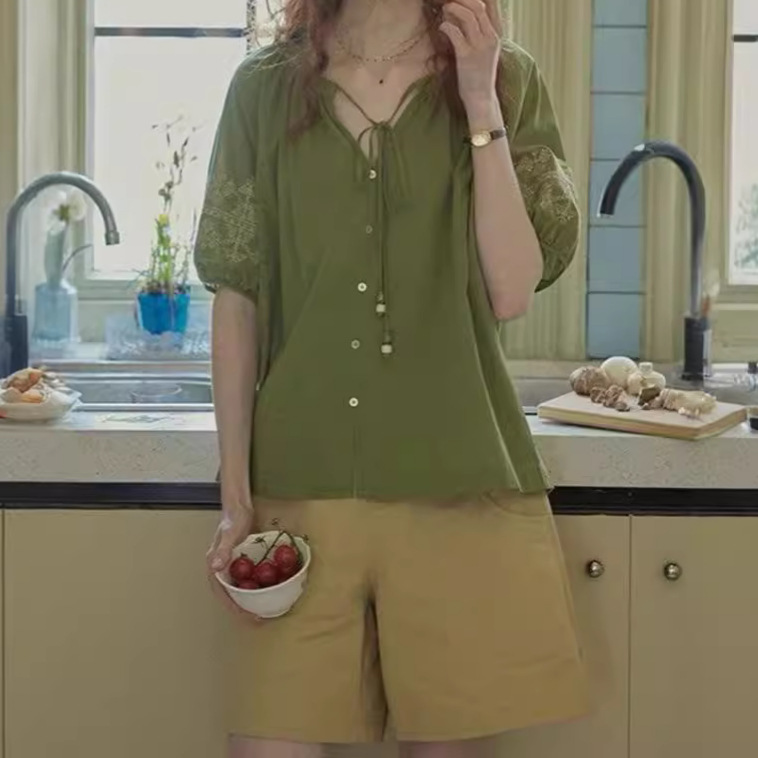 "十字回忆"苔绿色法式复古刺绣上衣女松弛慵懒感衬衫夏季新款