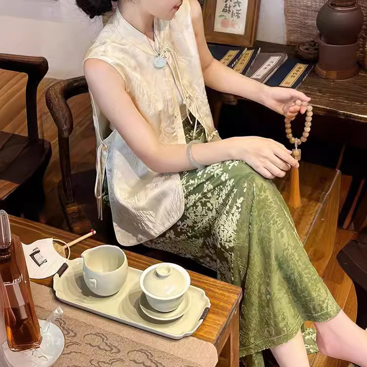 新中式女轻国风上衣盘扣马甲绿色半身裙夏季气质小众两件套