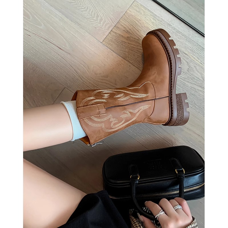 复古真皮厚底刺绣西部牛仔靴小个子川西旅游中筒靴女马丁靴子夏季