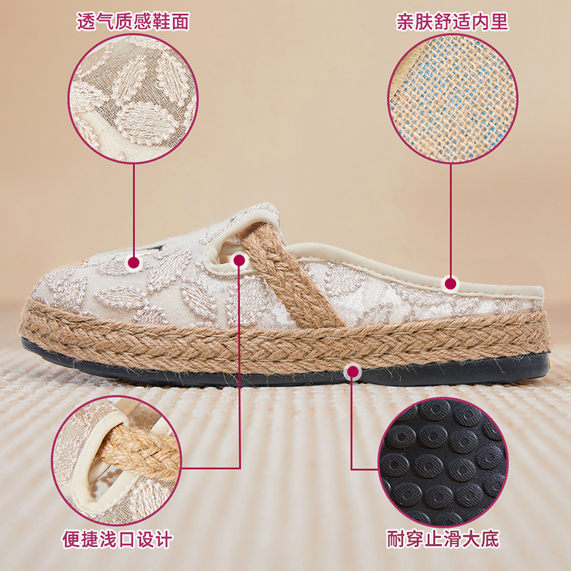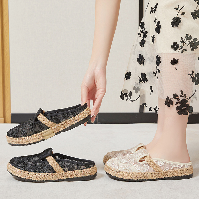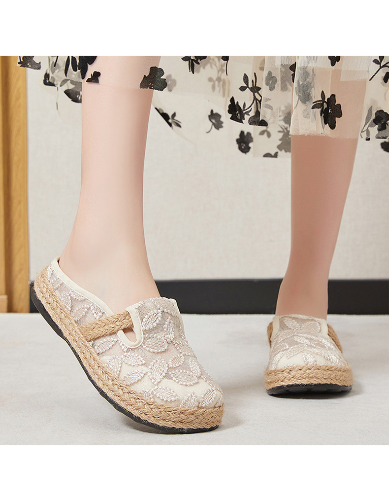 夏季新款网纱亚麻编织一脚蹬渔夫半拖民族风绣花凉鞋