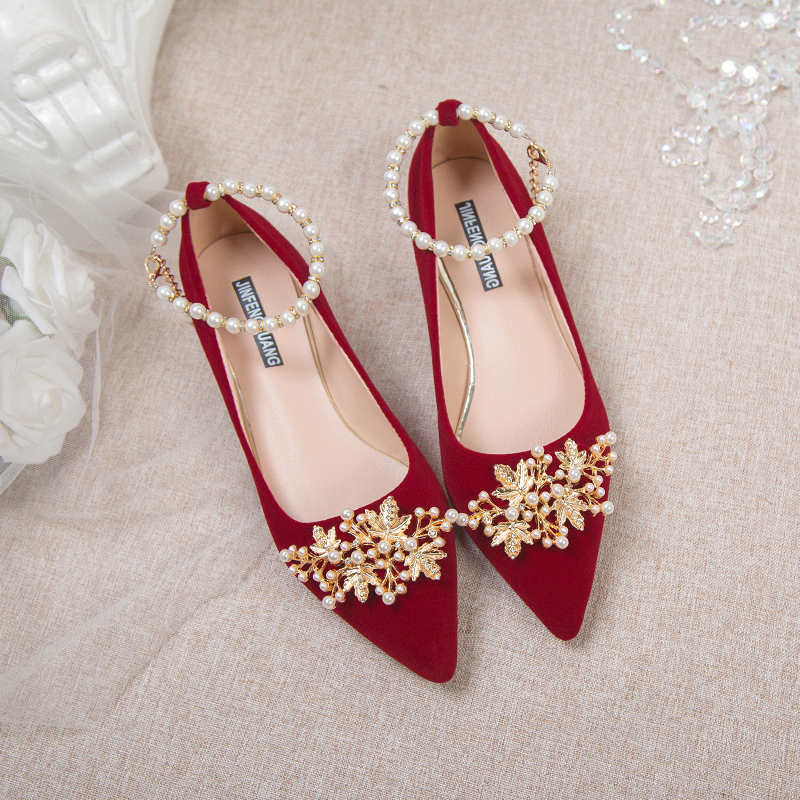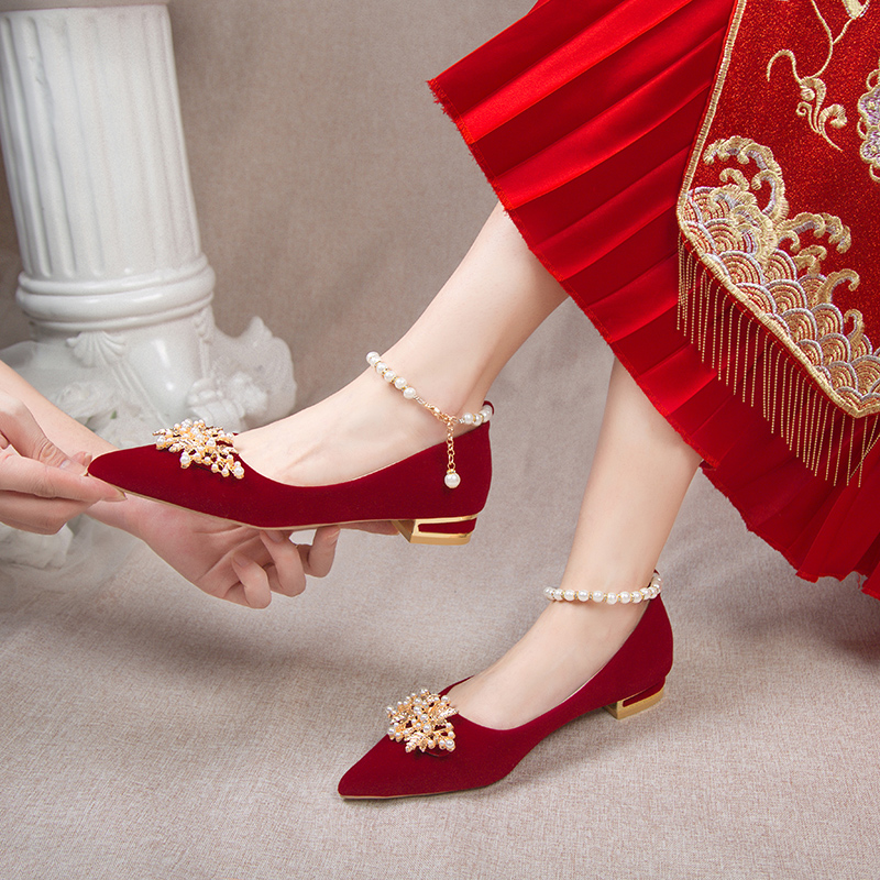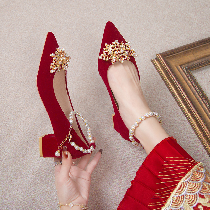 单鞋女鞋蝴蝶结水钻仙女风尖头红色粗跟2厘米