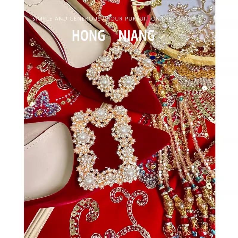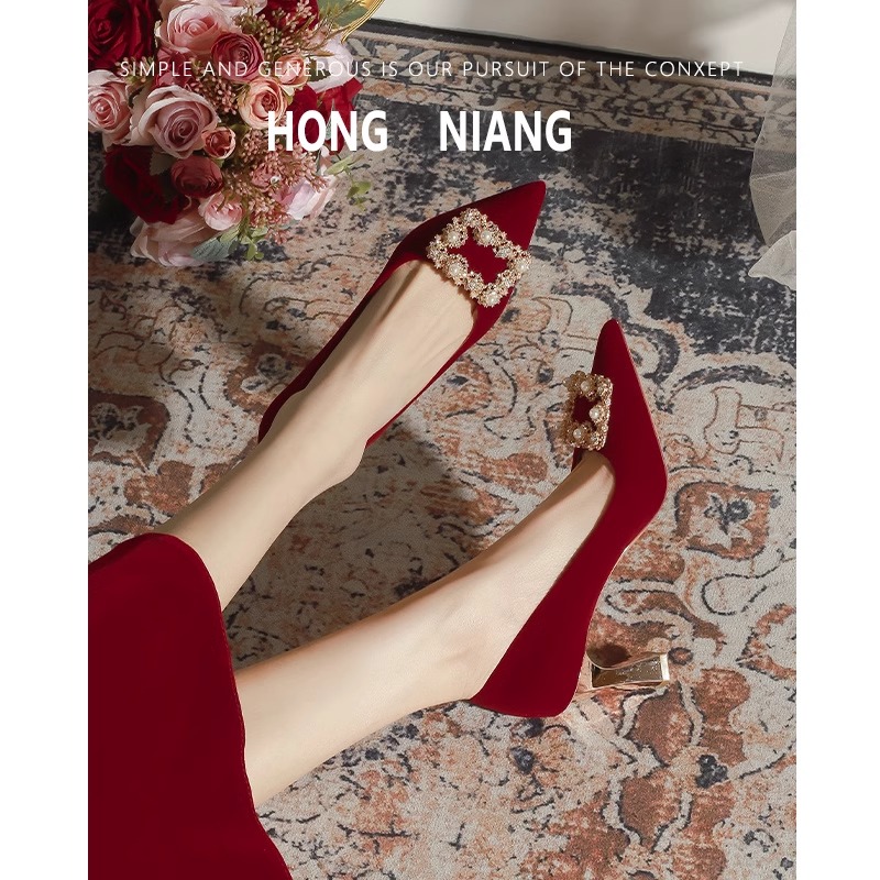 红色婚鞋女2025新款秀禾婚纱两穿新娘鞋粗跟不累脚订婚绒面高跟鞋