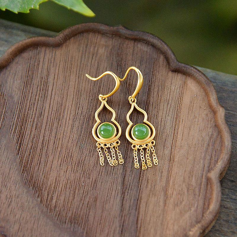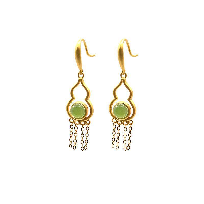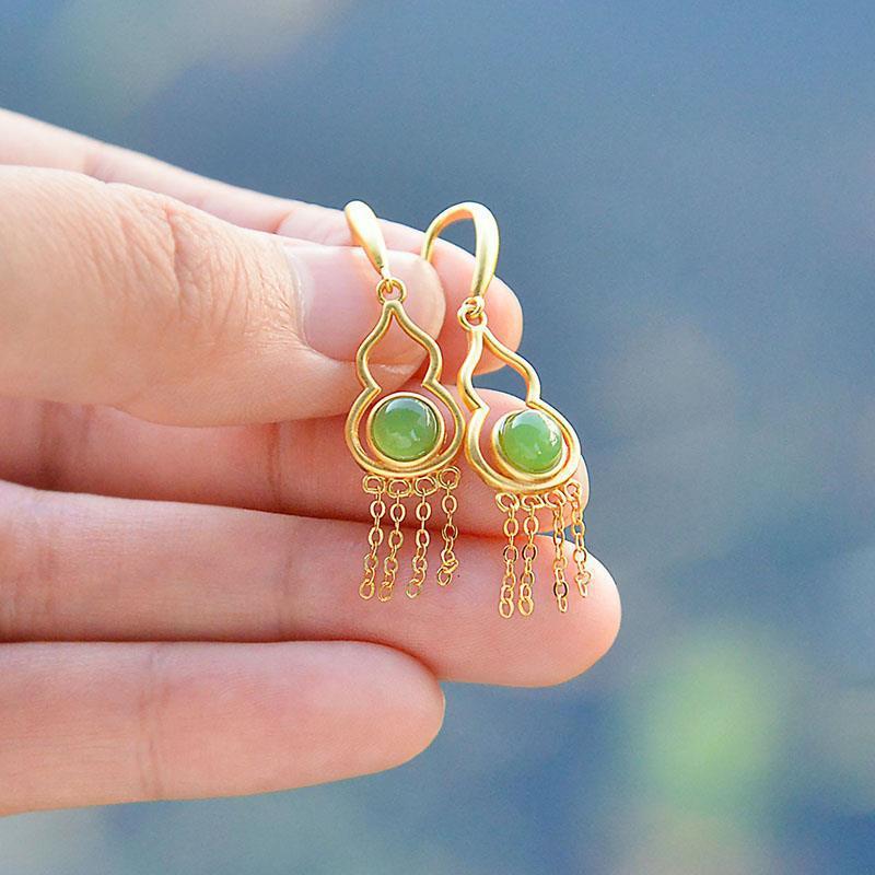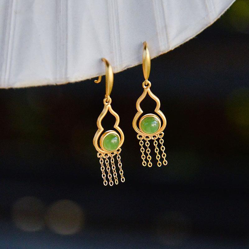 灵乐丨天然和田碧玉小葫芦流苏耳环S925纯银玉石耳坠民族古典耳饰