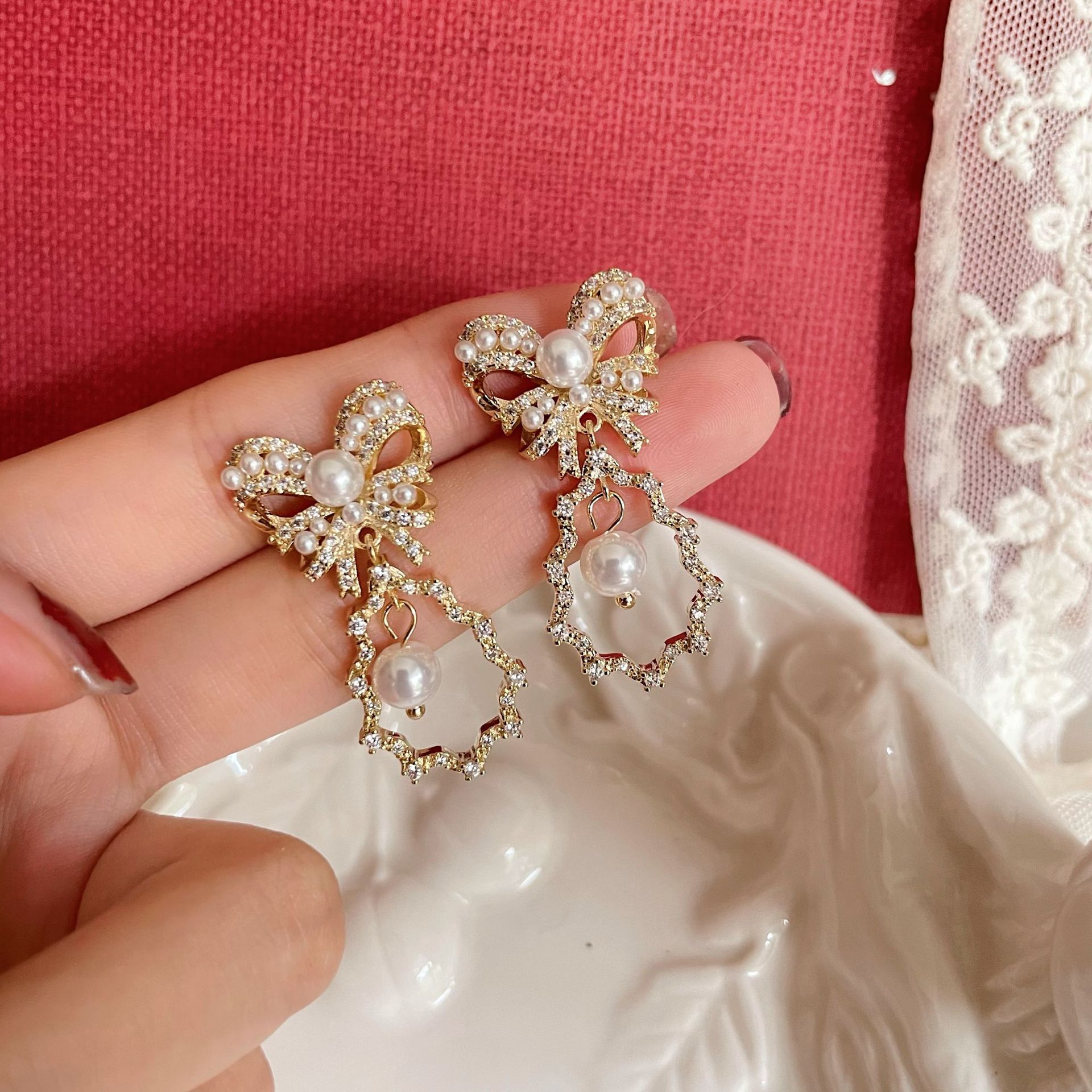 「少女的祈禱」jue美软妹子~法式蝴蝶结满钻珍珠耳坠甜美耳环