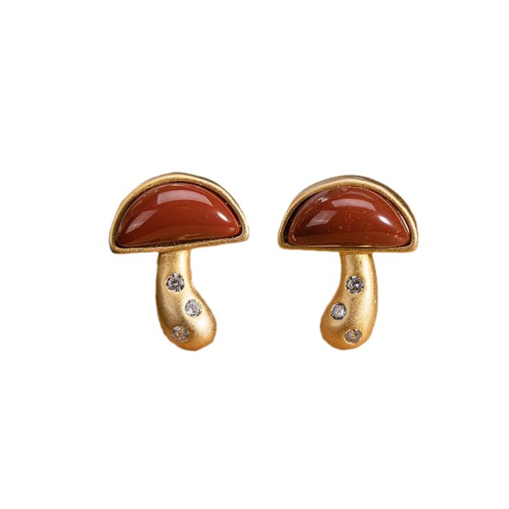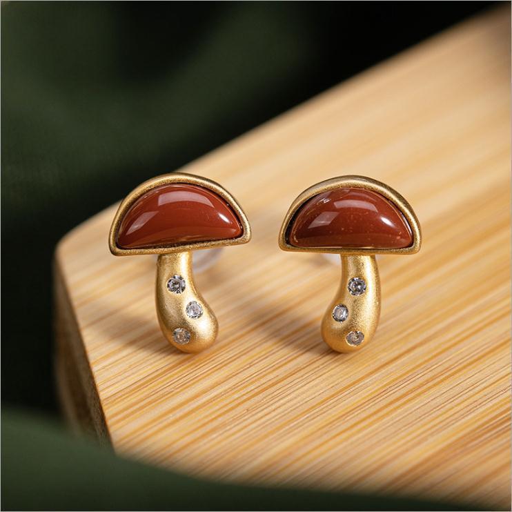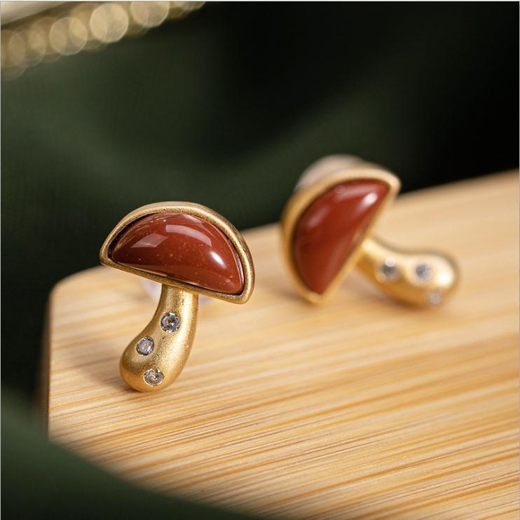南红玛瑙精致小巧小蘑菇耳钉银镀金镶钻小可爱耳饰女款精美玉