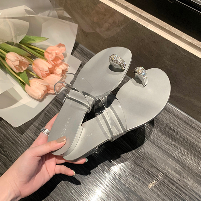 夏季新款闪亮水钻套趾圆头透明一字带平底矮粗跟凉拖鞋