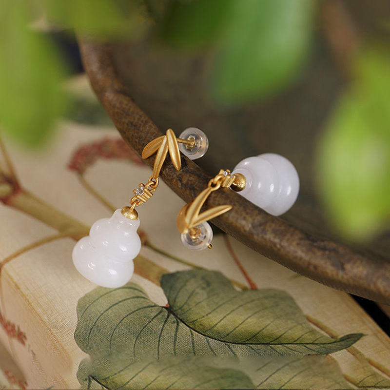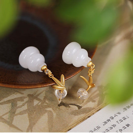 纯银鎏金工艺耳坠女款天然白玉石葫芦精致小巧优雅耳饰耳钉