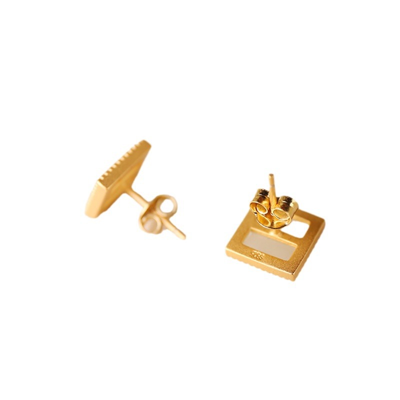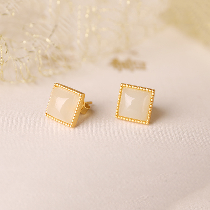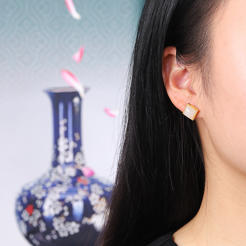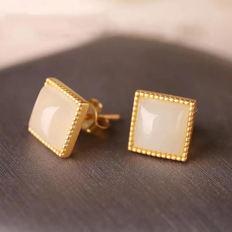 S925纯银天然和田白玉镀24k金方形耳钉小众设计女