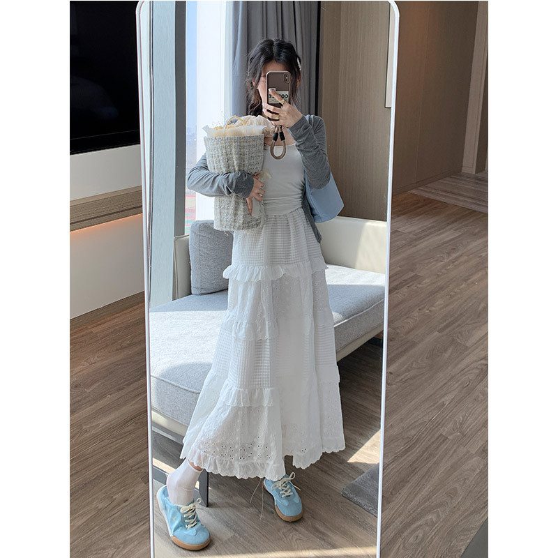 白色半身裙女春秋季高腰显瘦温柔风a字裙中长款蕾丝蓬蓬蛋糕裙子