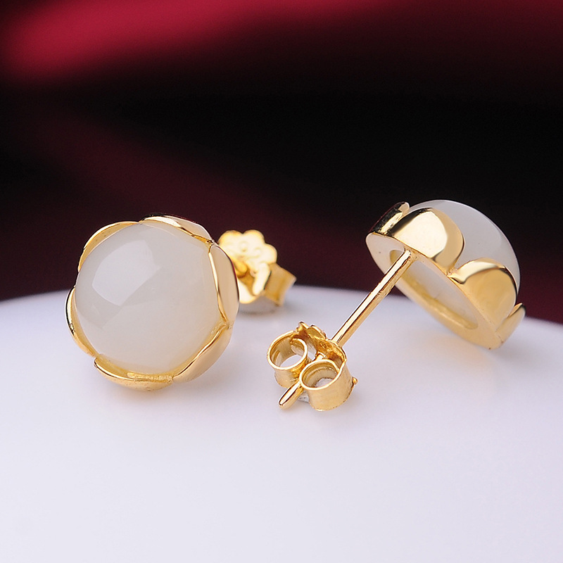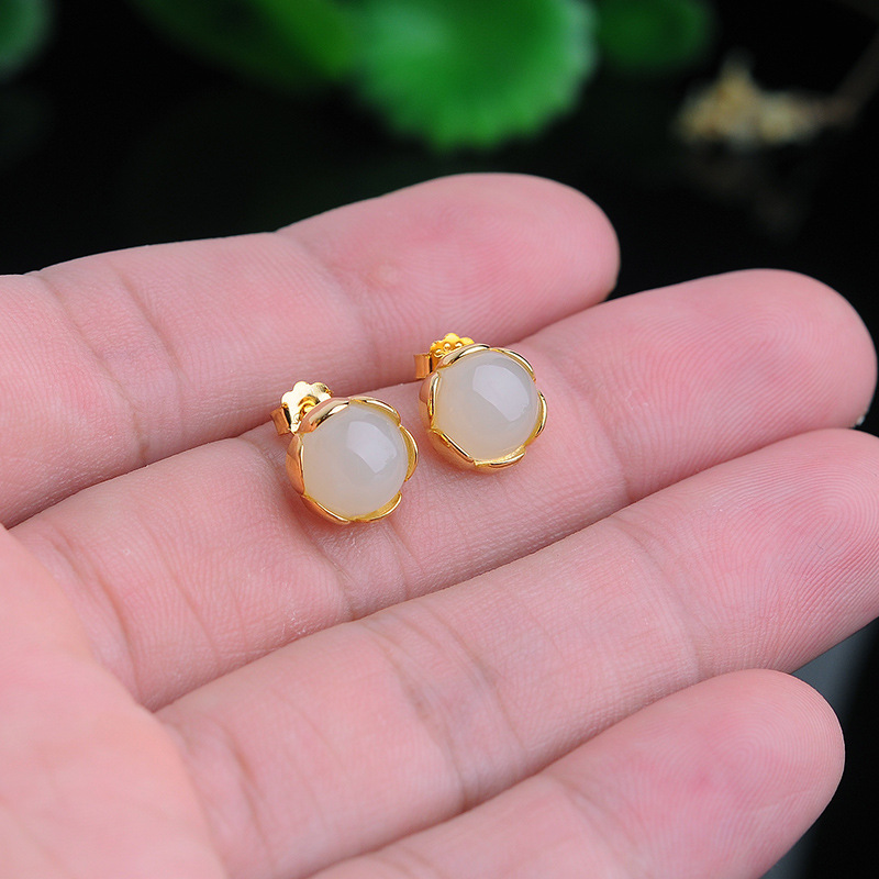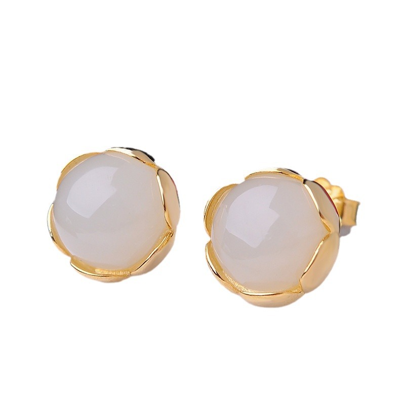 含苞和田白玉石小耳钉饰女纯银旗袍妈妈新中式宋代翡翠耳环