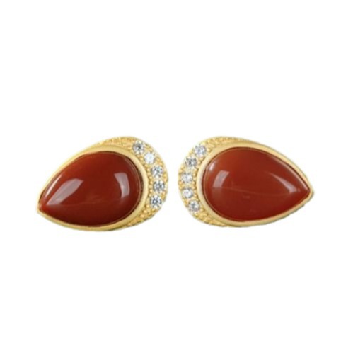 小巧镶嵌锆石小众简约天然南红玛瑙耳钉女气质镀925纯银几何耳饰