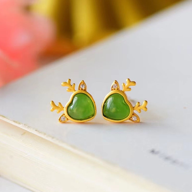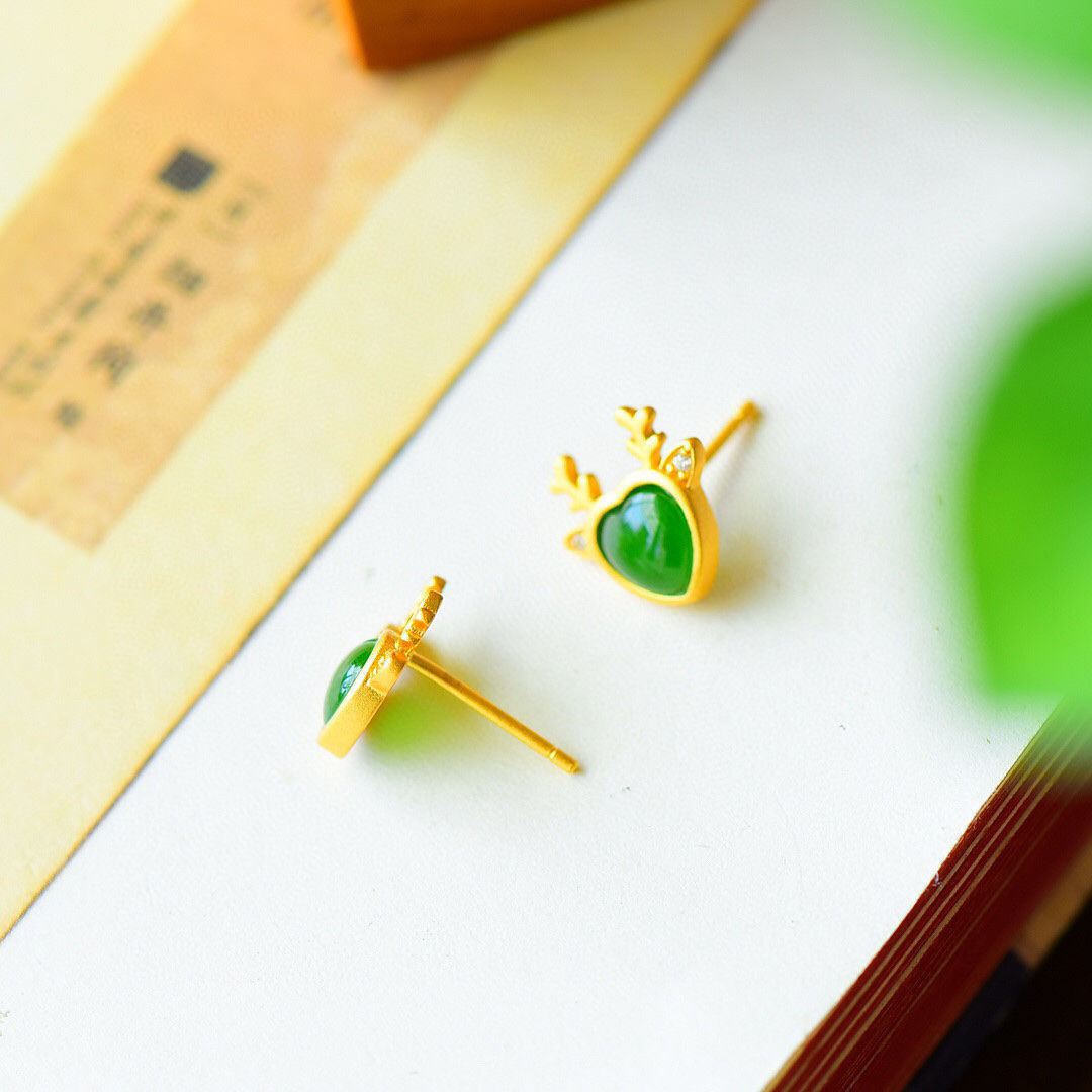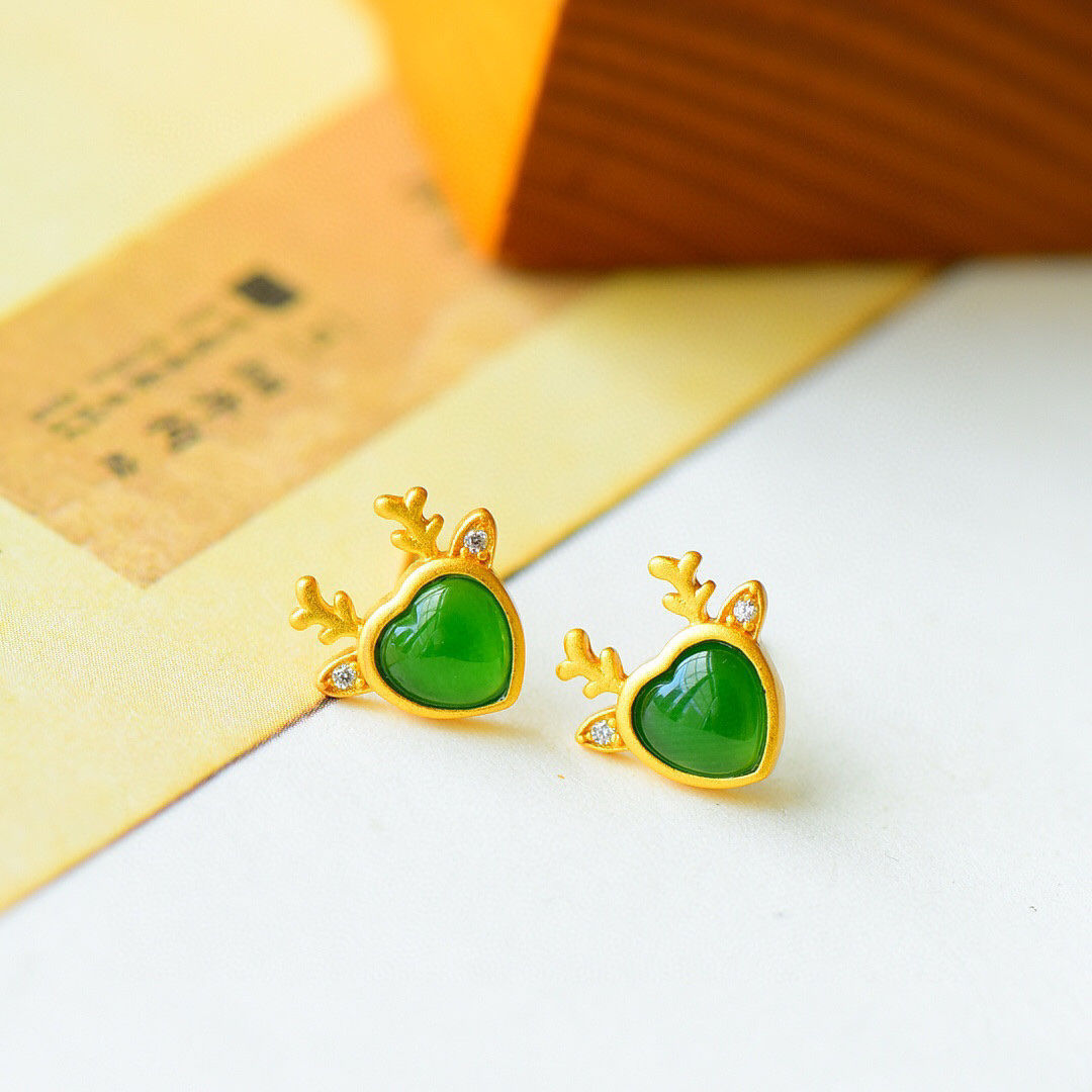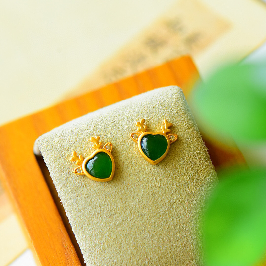 古法金镶嵌天然碧玉耳钉小鹿造型简约清新小巧甜美百搭耳环女友