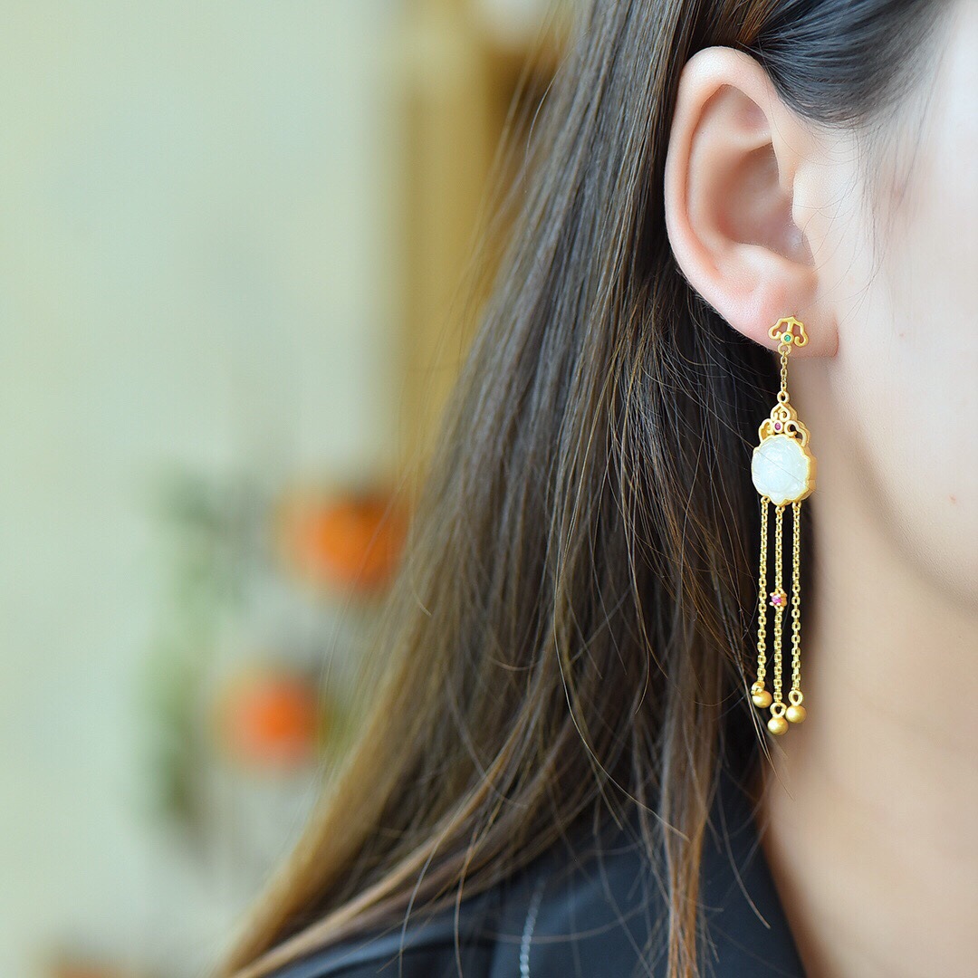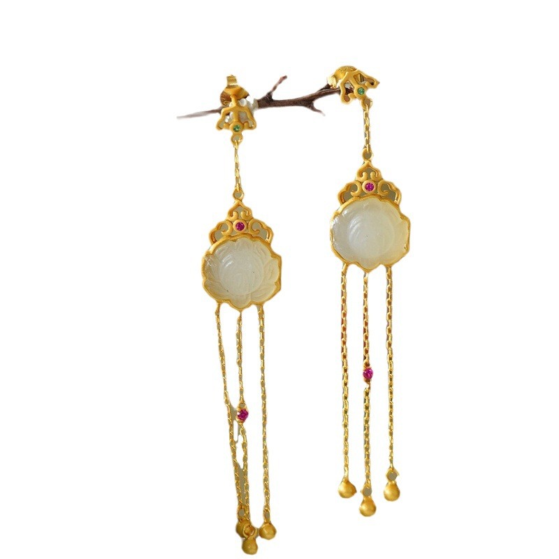 天然和田青玉青白玉莲花镶嵌银饰流苏挂坠 饰品DIY配件