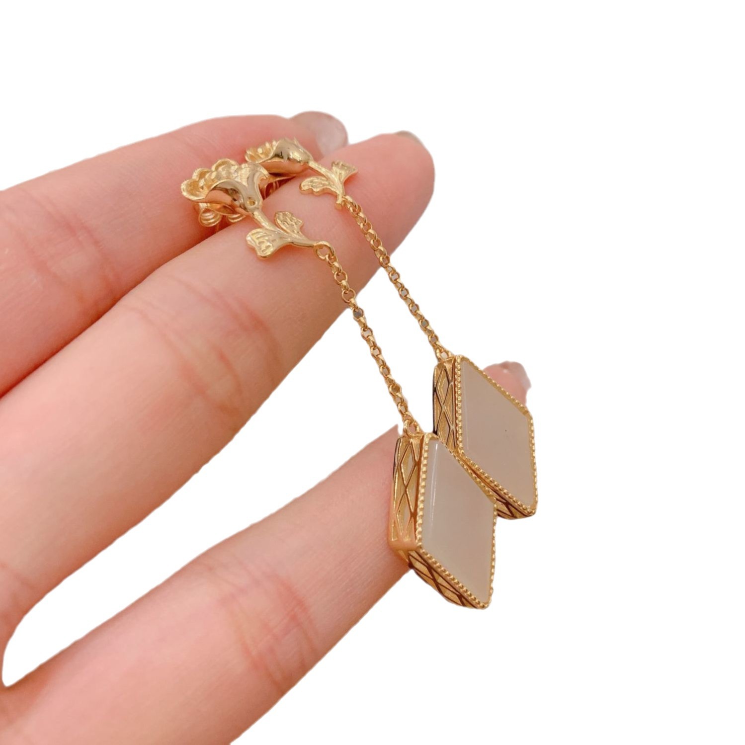 s925纯银镶嵌镀金和田玉白玉个性几何形气质女士银耳钉耳饰