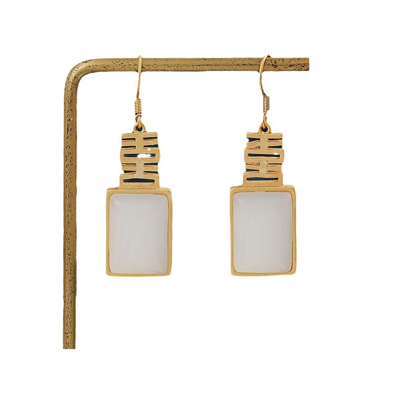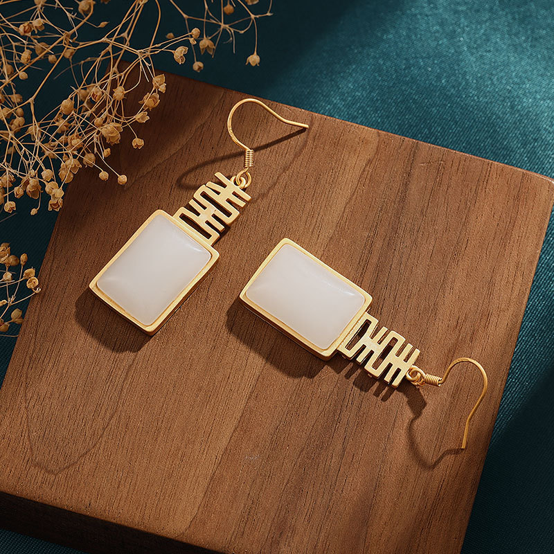 国潮风设计旗袍汉服耳饰古法镀金镶嵌和田玉喜字耳坠耳环女