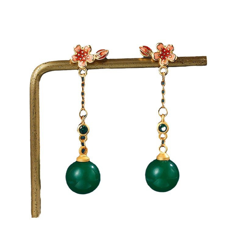 宫廷风设计国潮新品珐琅彩配饰镶嵌天然玉髓流苏古法金耳钉耳环女