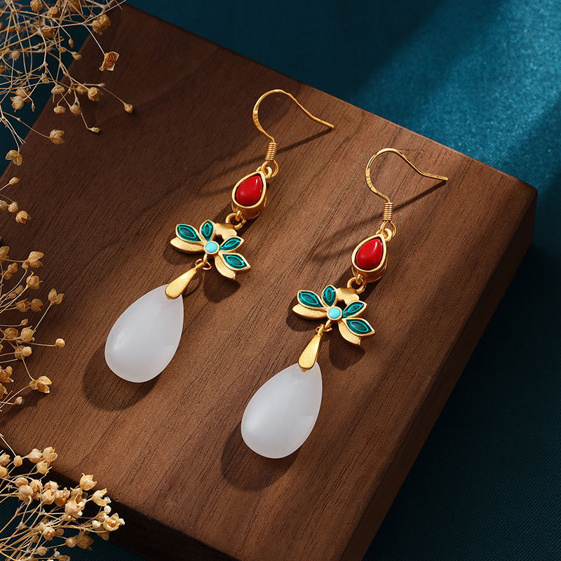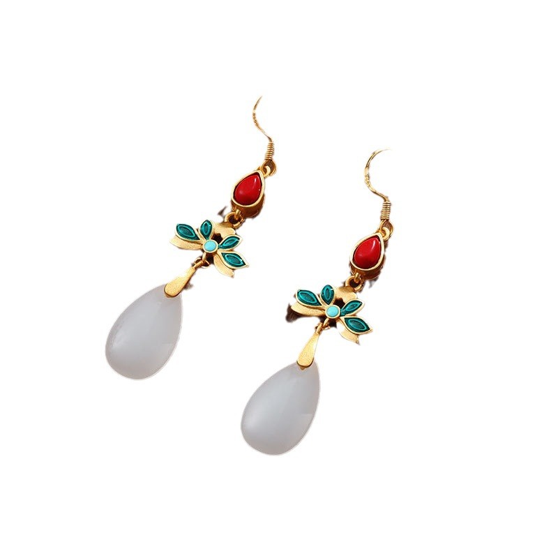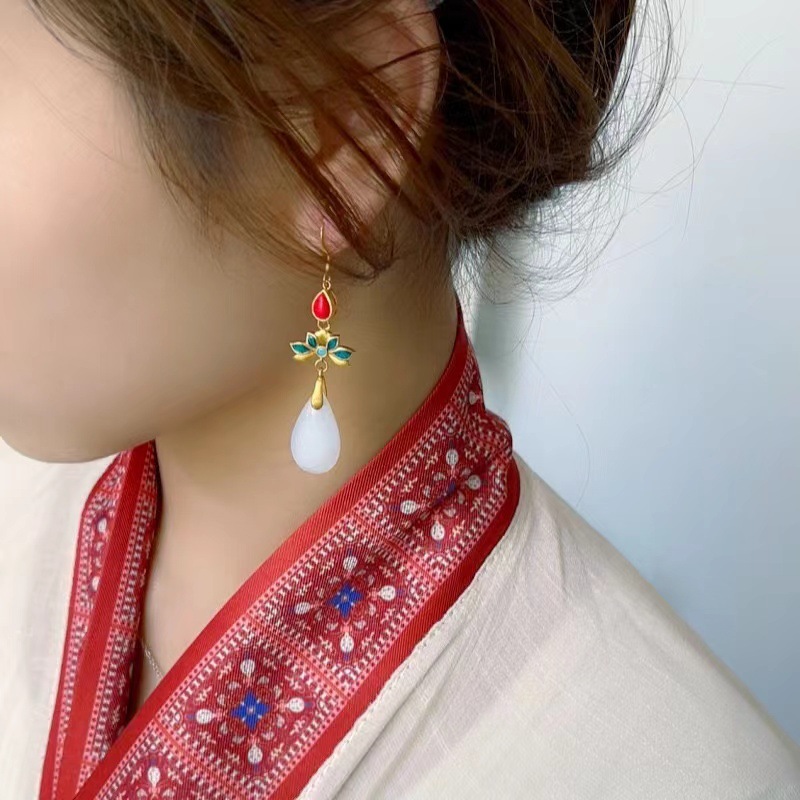 汉服宫廷中式耳坠中国复古风和田耳环宋代阳绿耳钉旗袍流苏耳饰