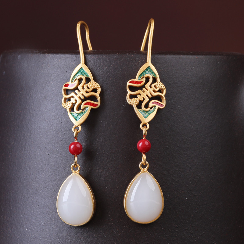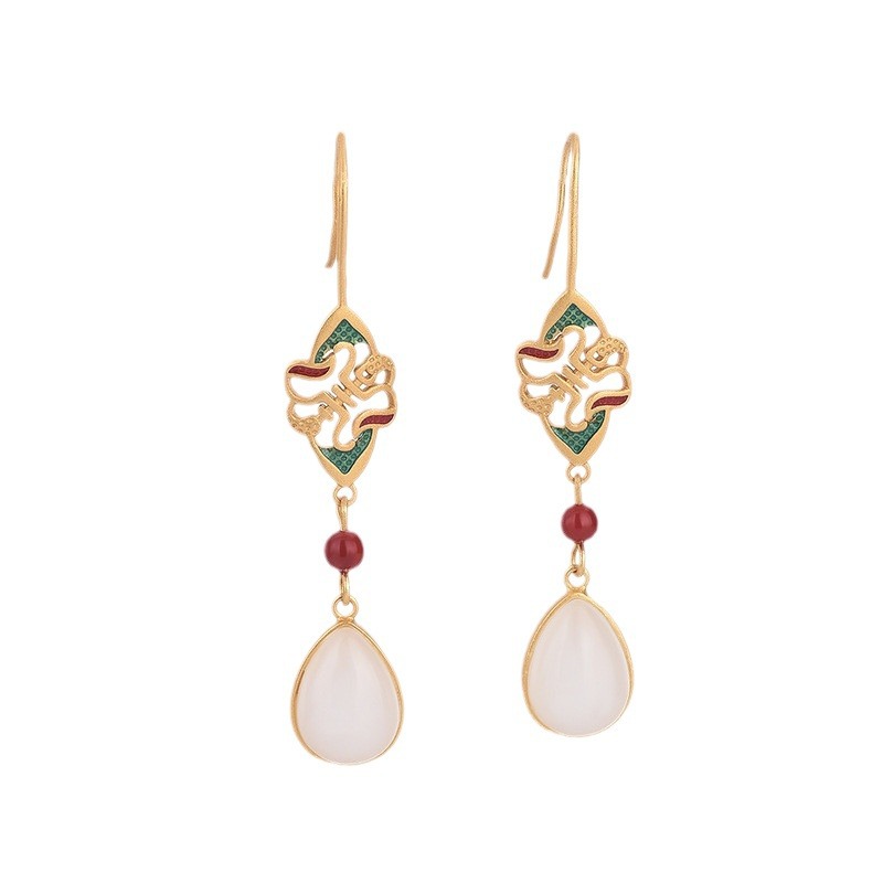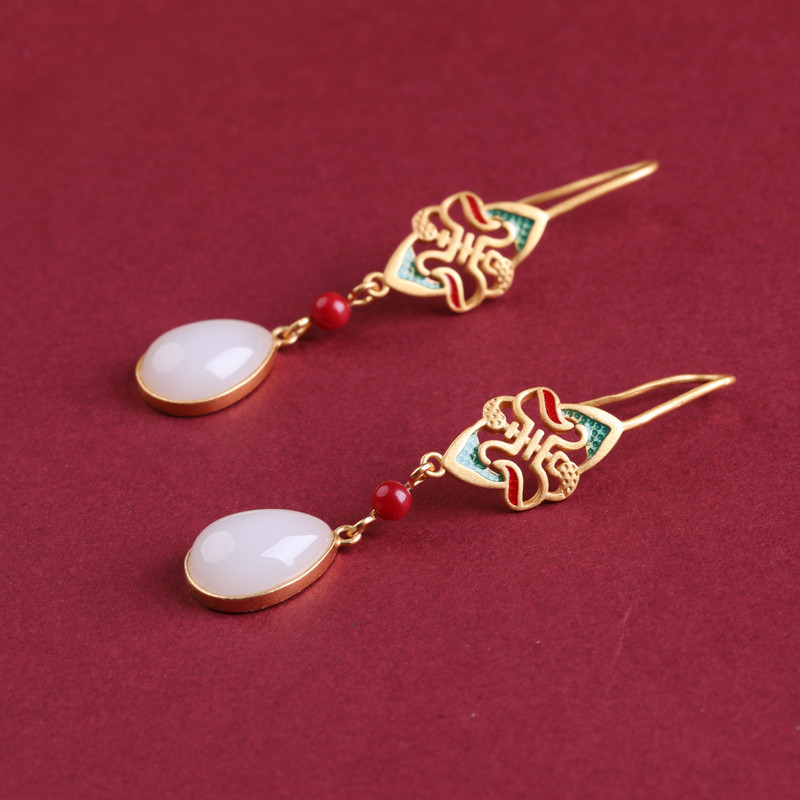新款中国风古法镀金冷珐琅滴釉配饰镶嵌复古玉石水滴耳环耳坠女式