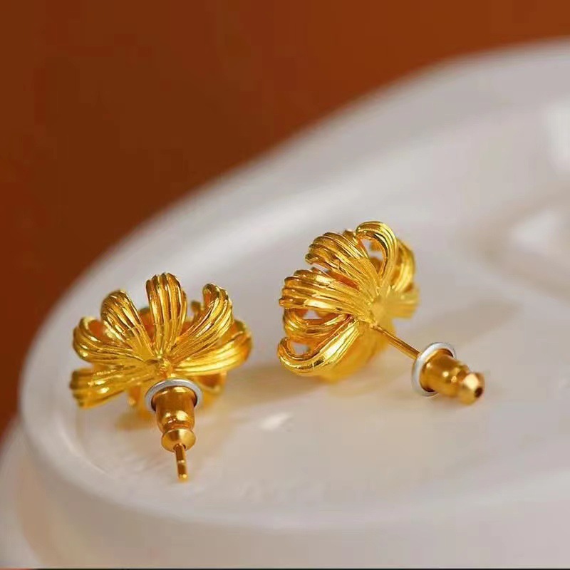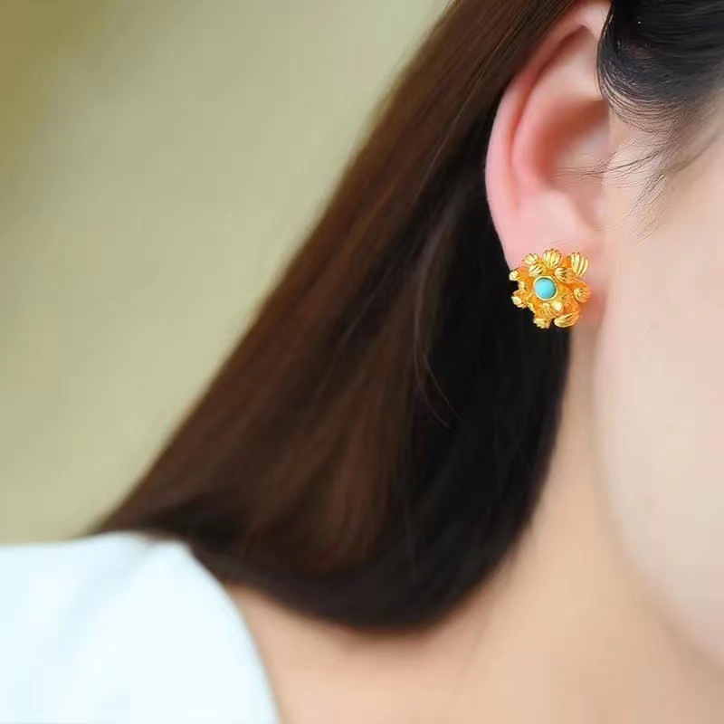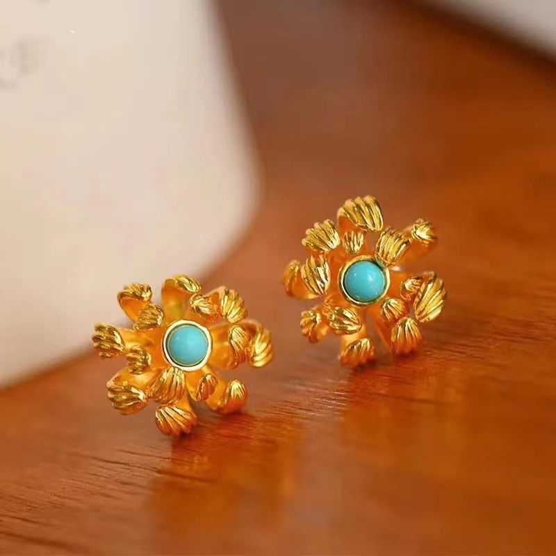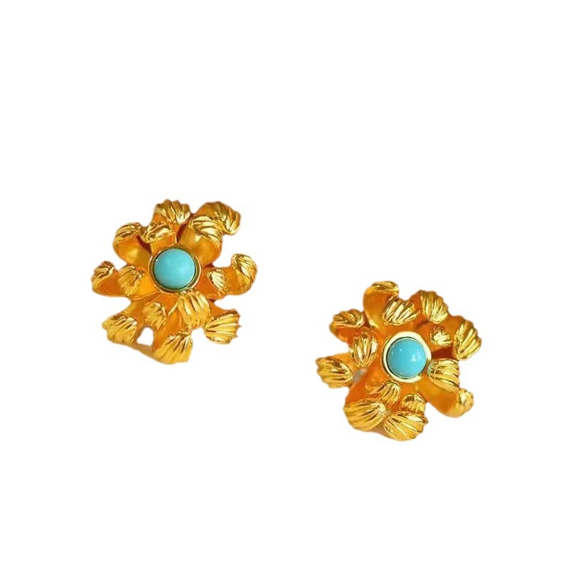 925银镀金花卉绿松石古风国潮宫廷风气质复古女士时尚百搭耳钉