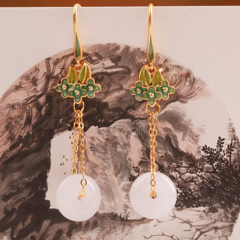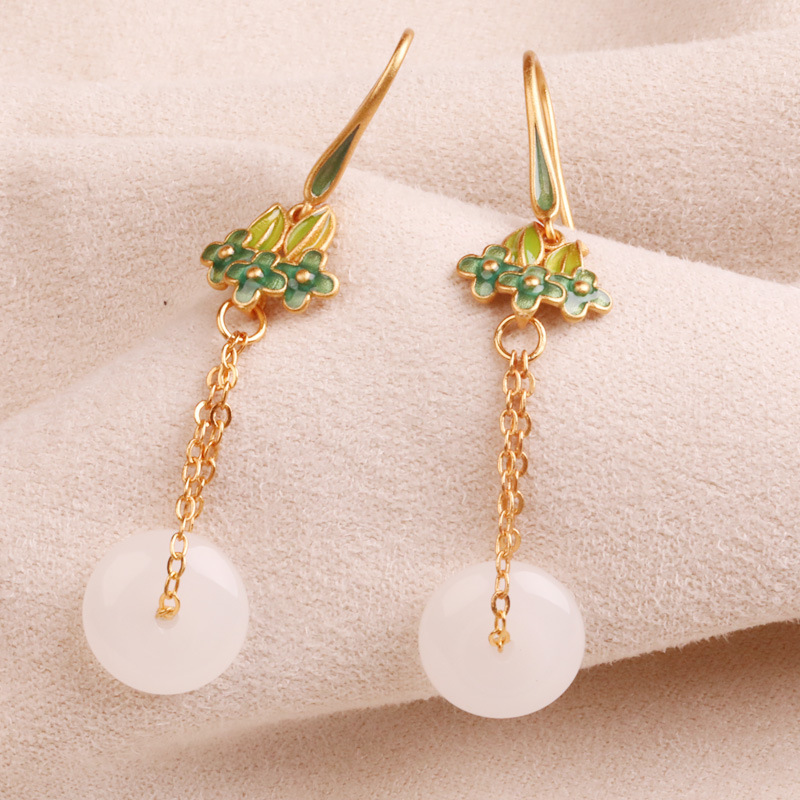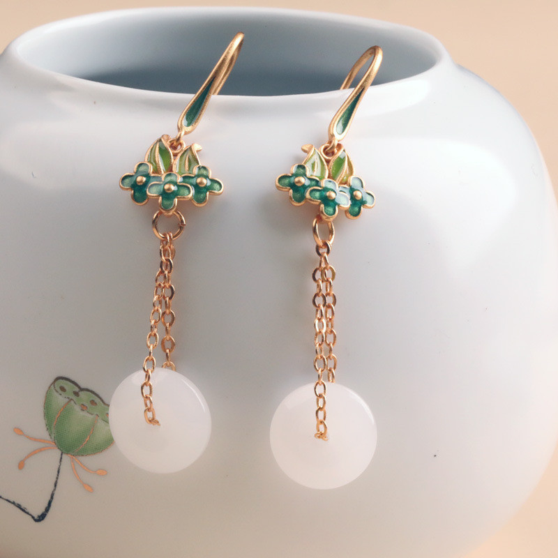汉服宫廷中式耳坠中国复古风和田耳环宋代阳绿耳钉旗袍流苏耳饰