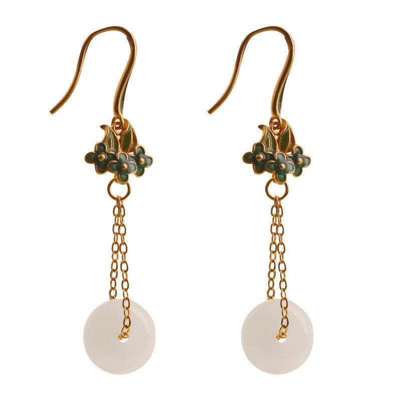 原创复古国风汉服古法镀金中国结镂空玉髓四叶草古风气质绿色耳环