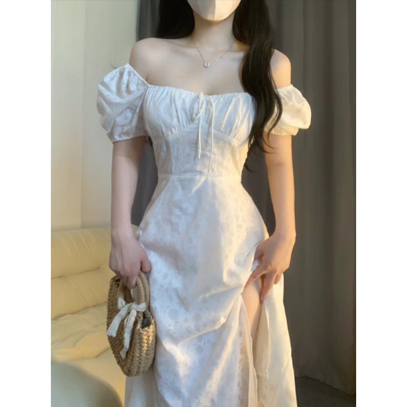 法式初恋泡泡袖连衣裙女夏季高级感气质收腰一字肩开叉长裙
