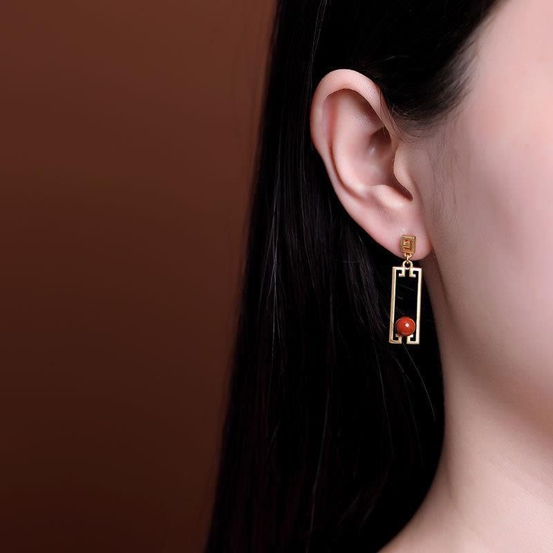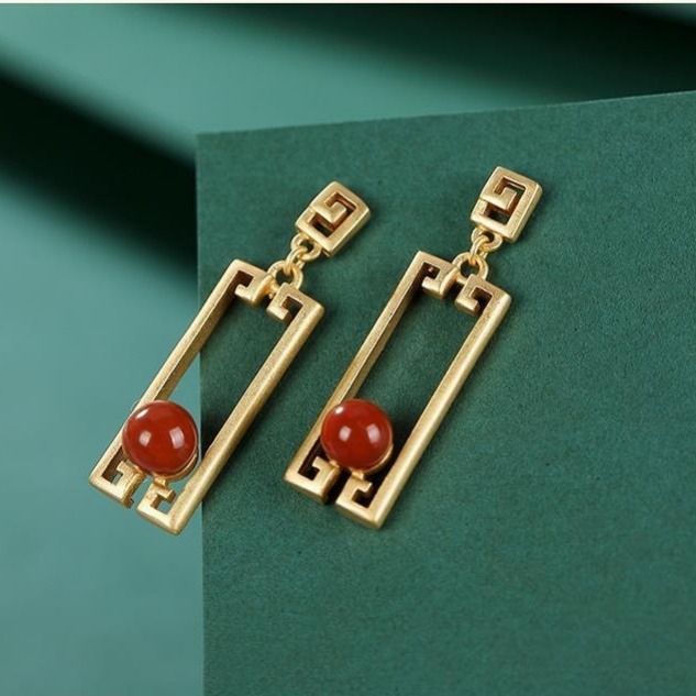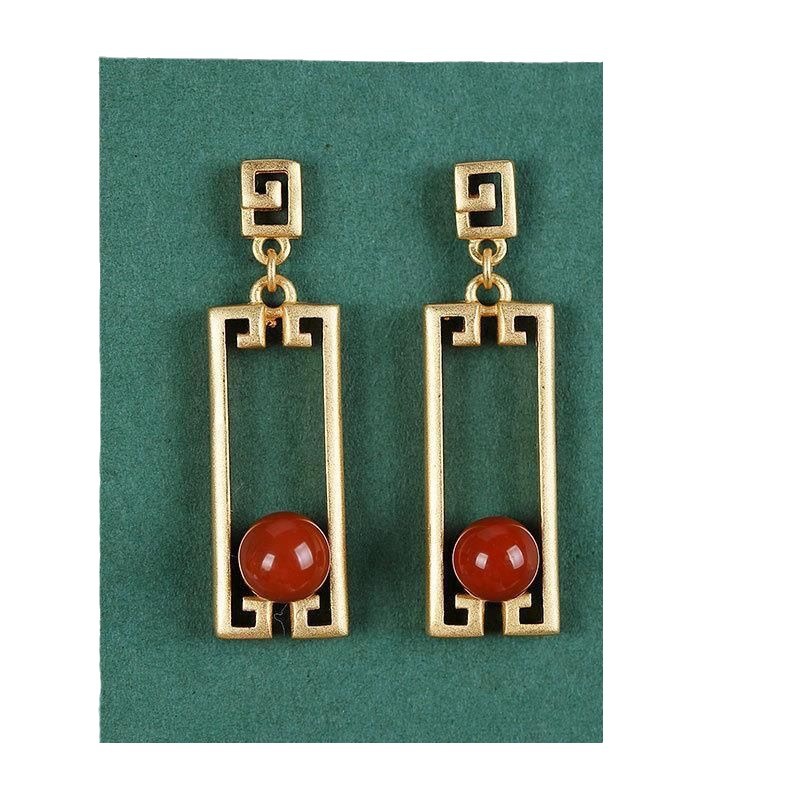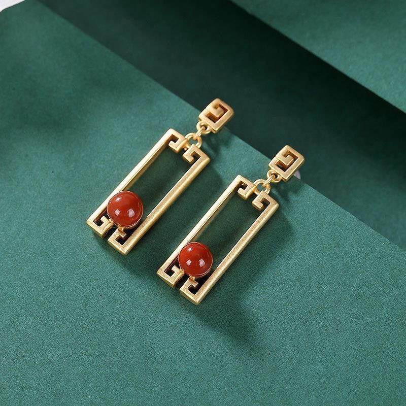 镀925银针南红复古古风长方形特别个性几何形女士耳坠耳钉耳