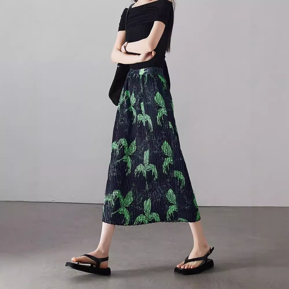 复古三宅褶皱裙印花松紧腰半身裙女夏百搭显瘦牙签皱直筒长裙