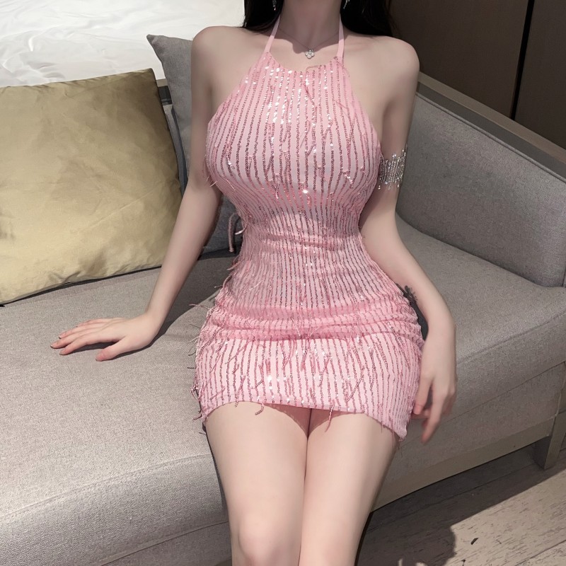 甜美辣妹性感风挂脖亮片流苏设计感粉色露背纯欲紧身包臀连衣裙女