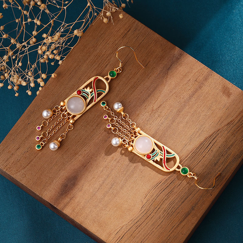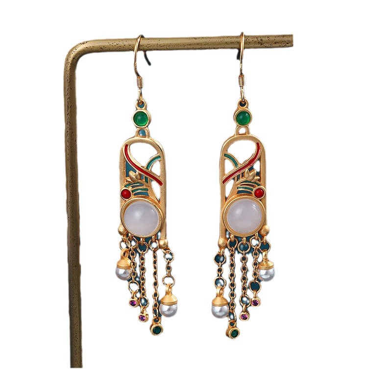 S925复古耳环古典中国风中式纯银鎏金珐琅彩凤凰耳坠天然和田玉女