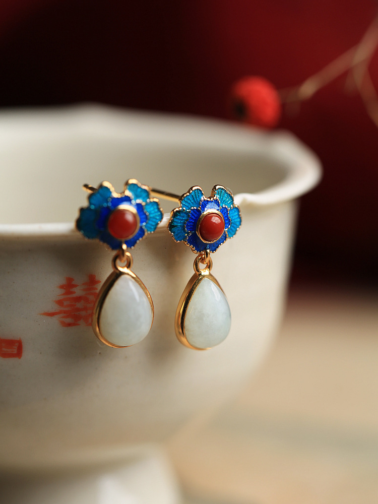 纯银古法金天然翡翠牡丹珐琅中国风复古水滴耳环女耳坠耳饰