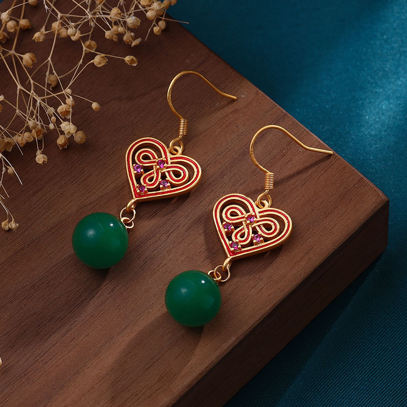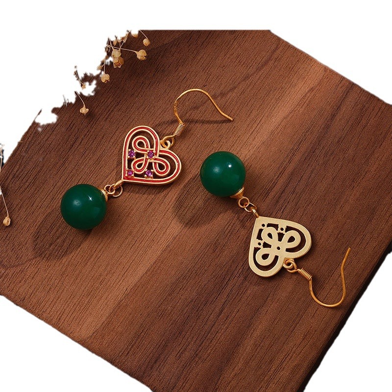 宫廷风设计复古鎏金碧玉爱心耳环长耳钩设计感耳饰时尚性感耳坠女