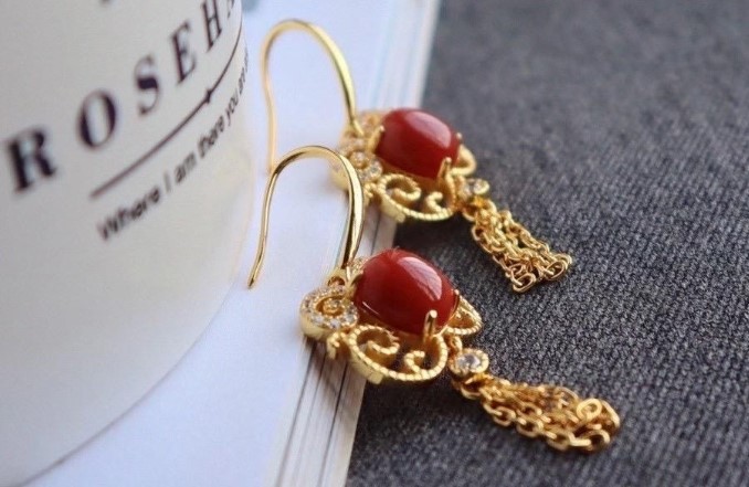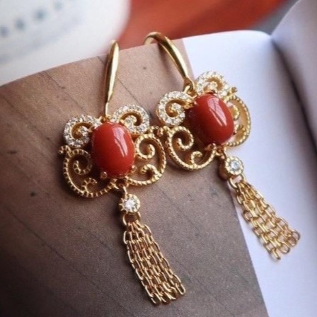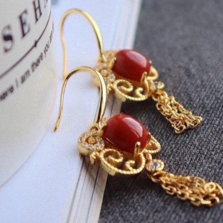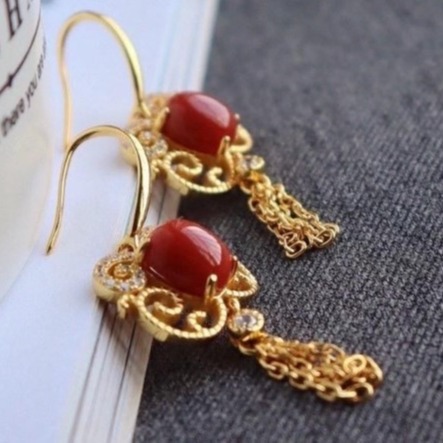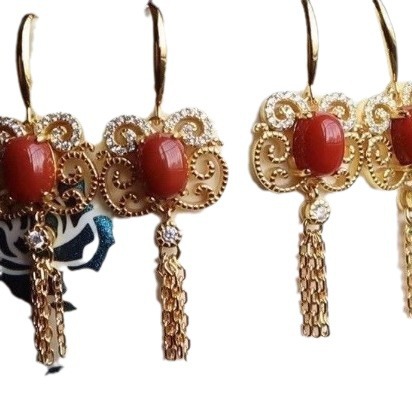 时尚高级天然红色石头镶刻皓石流苏设计复古风藏族特色耳环女款