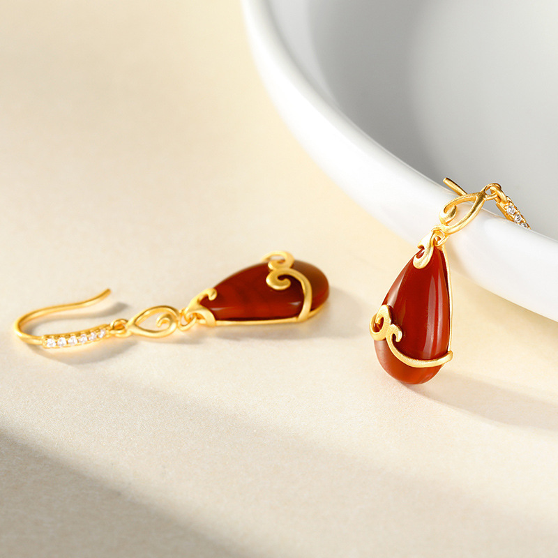 S925纯银金色镶嵌南红耳勾女款气质时尚南红石水滴耳环耳饰