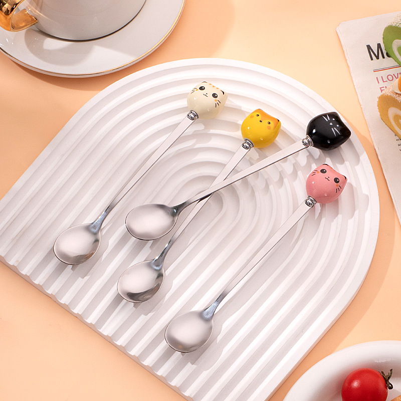 新款陶瓷卡通猫咪不锈钢餐具创意甜品勺家用儿童调羹不锈钢咖啡勺