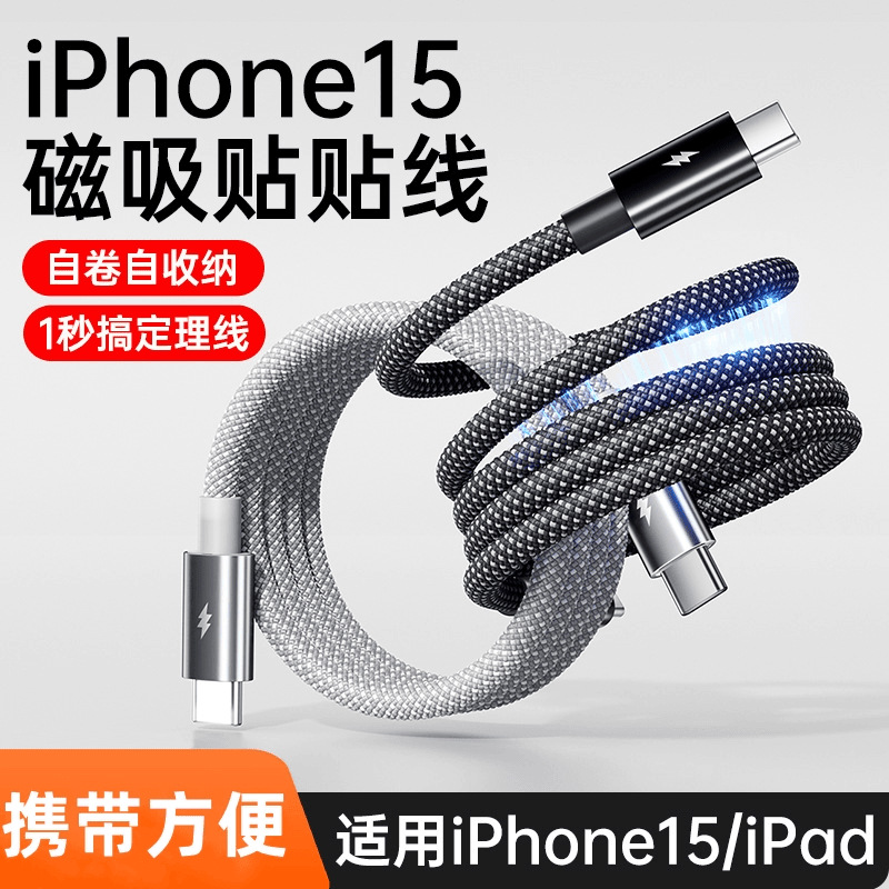 100W快充磁吸收纳typec数据线适用华为荣耀15苹果16编织27W充电线