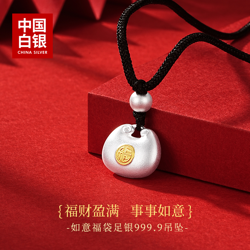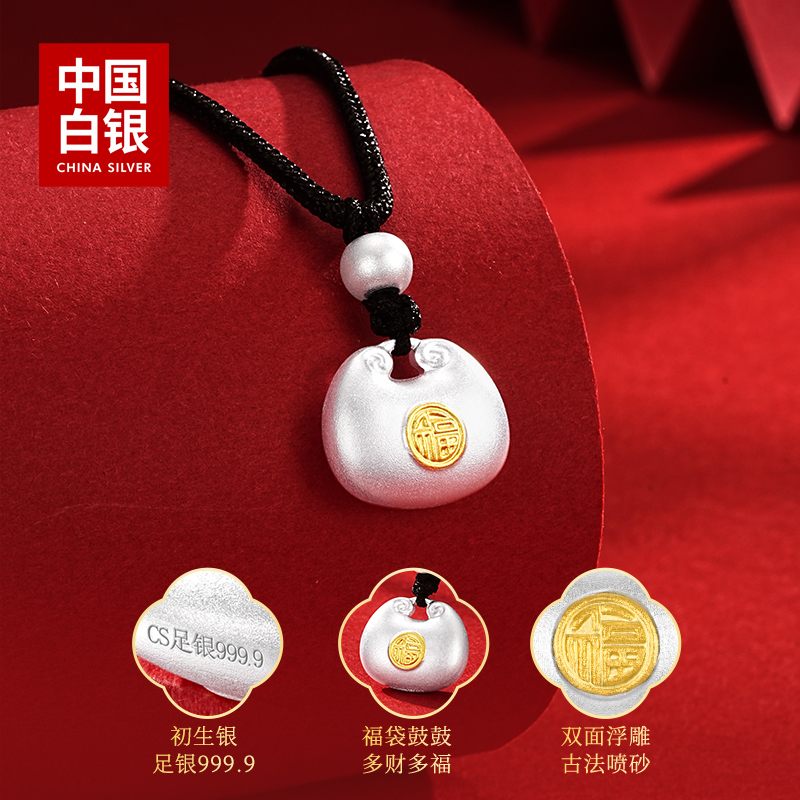 中国白银 足银999小胖福吊坠平安锁挂坠古法纯银福袋编织绳
