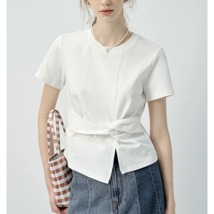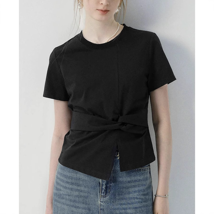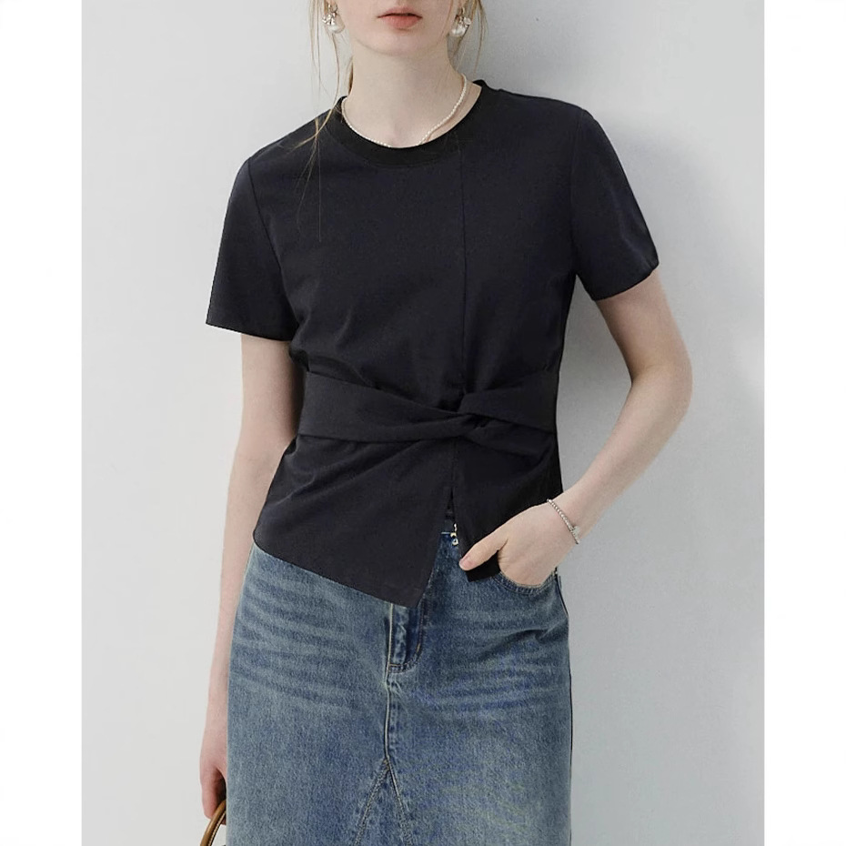VEGA 短袖t恤女2025新款气质休闲设计感不规则扭结收腰上衣