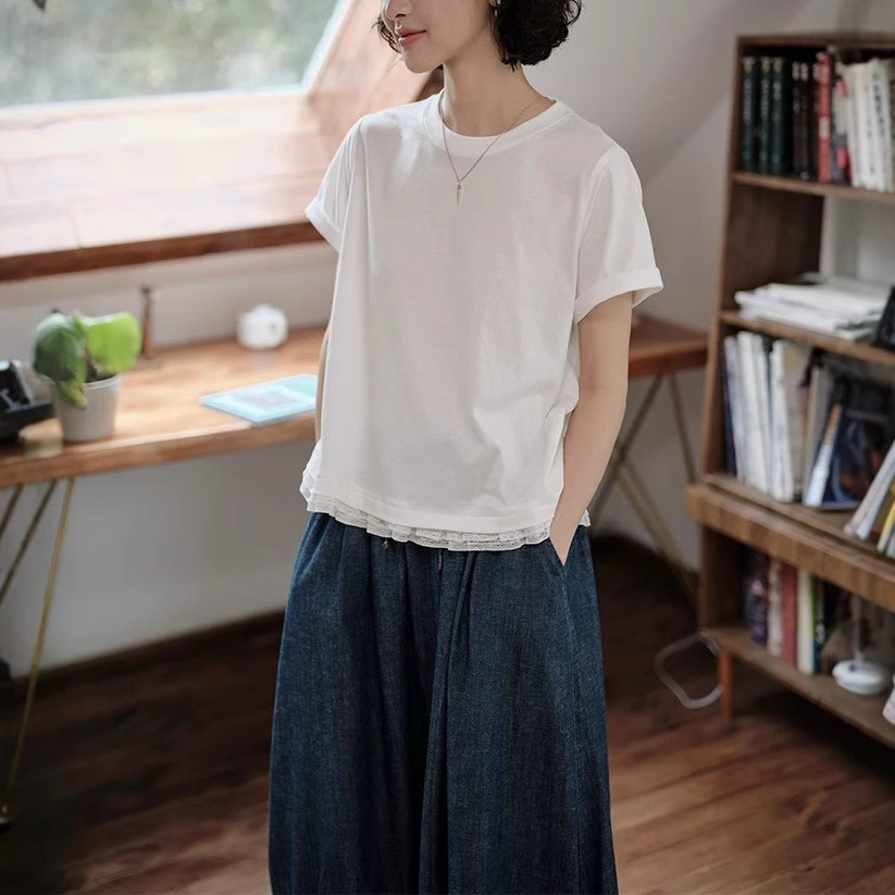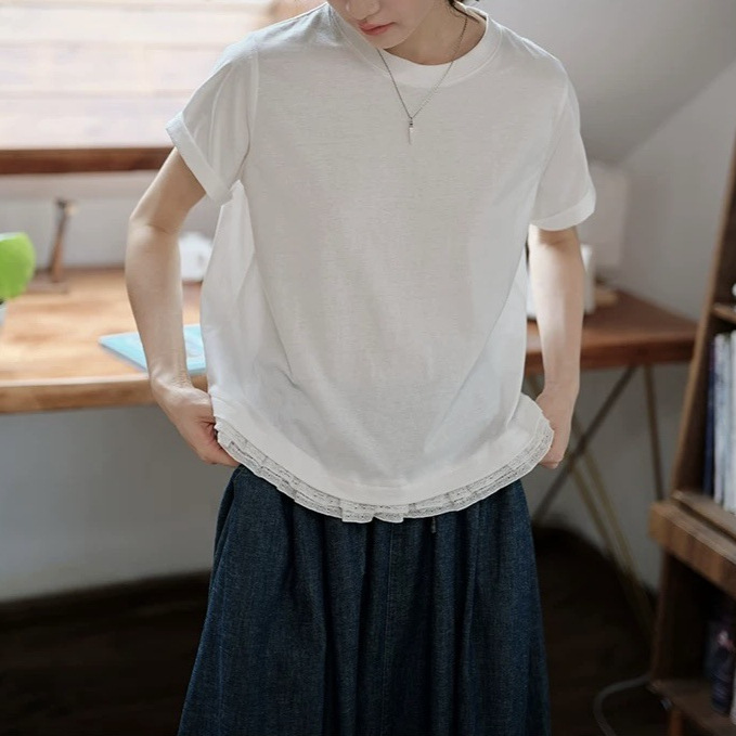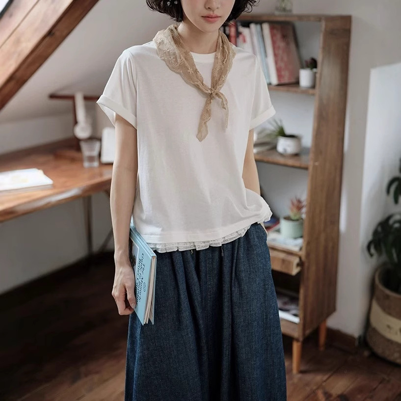 米白花边短袖上衣休闲文艺感日系风格穿搭女夏