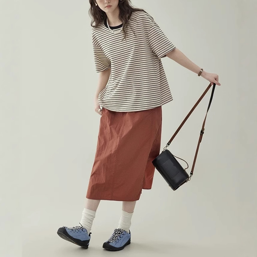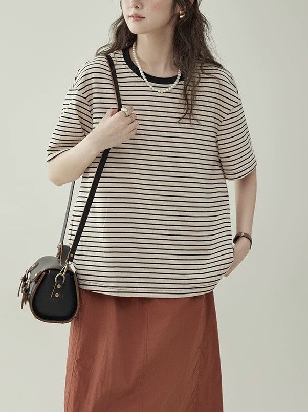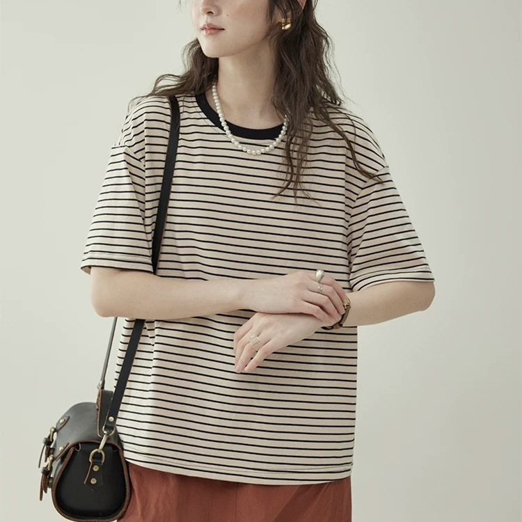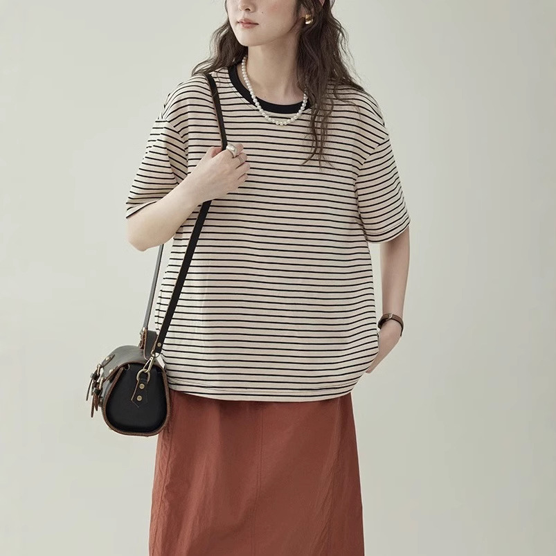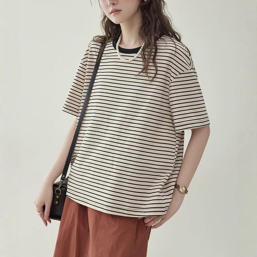 「北岛」条纹圆领后开衩t恤女夏季新款宽松短袖上衣