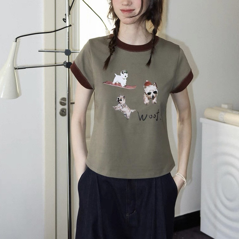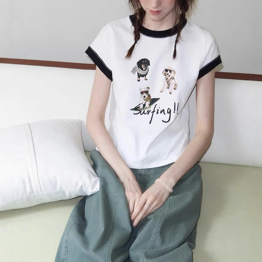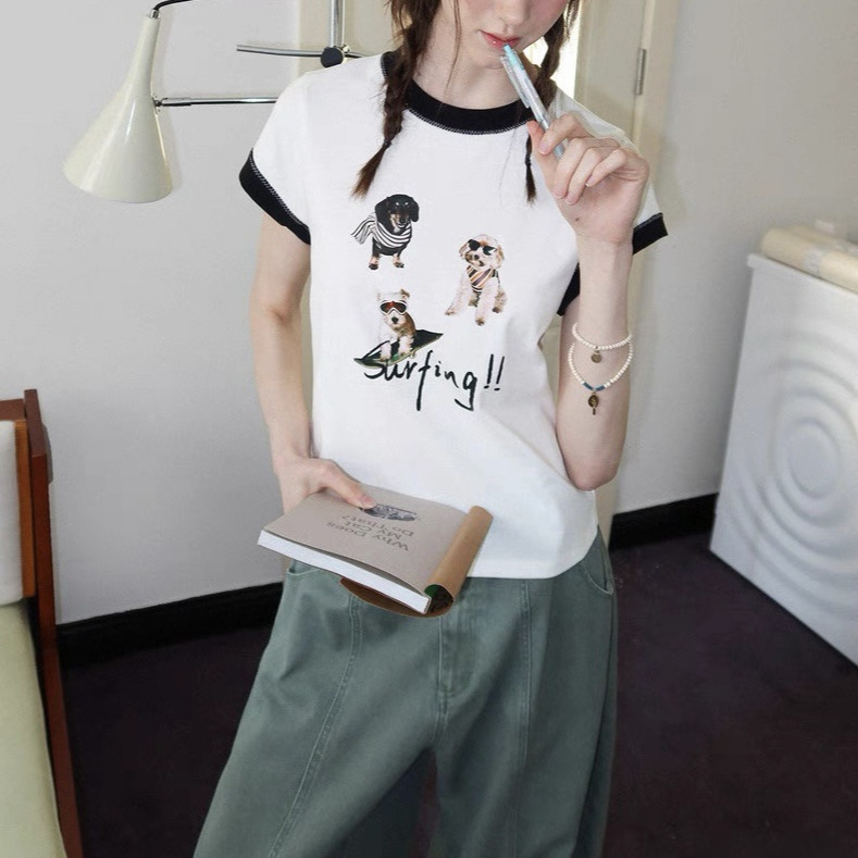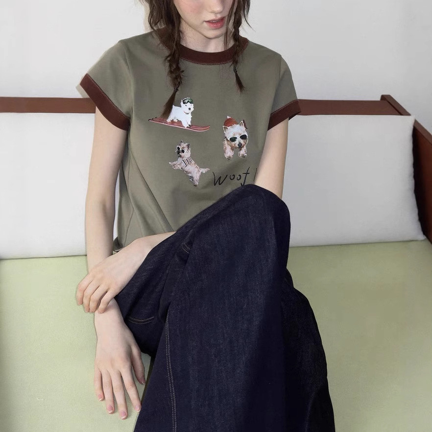 三只小狗/细腻纱织修身小版型撞色复古短袖T恤女