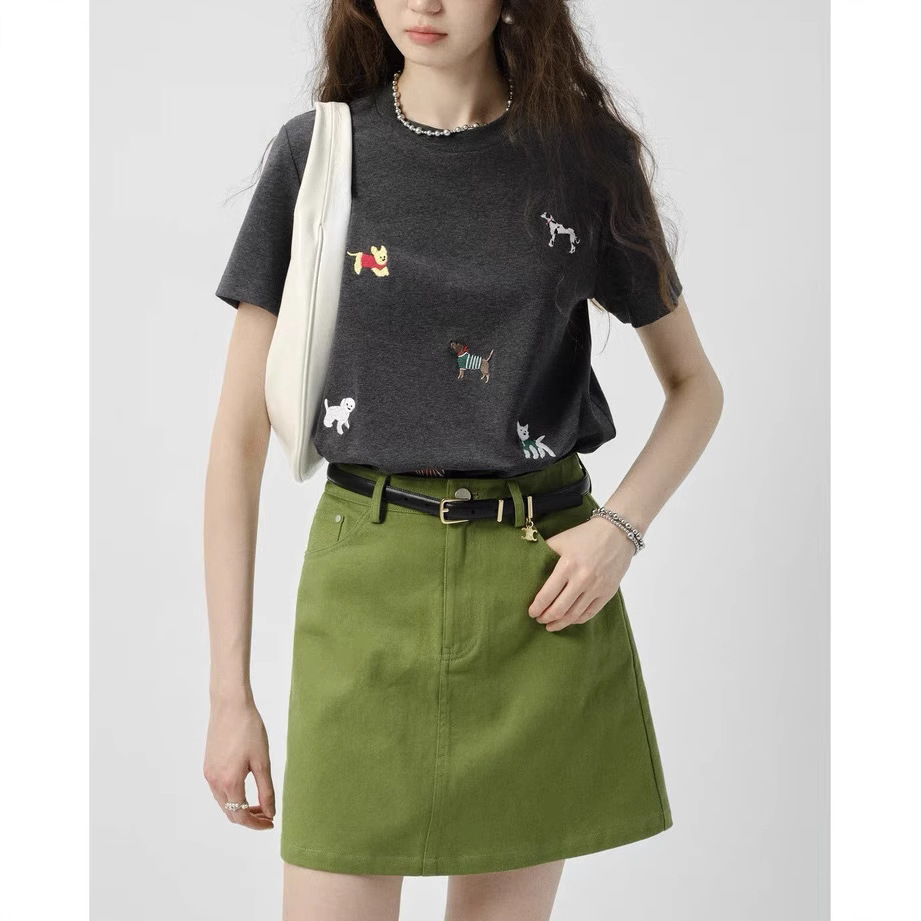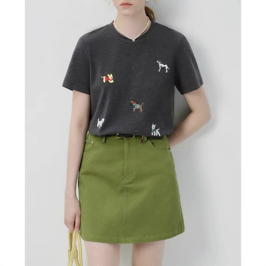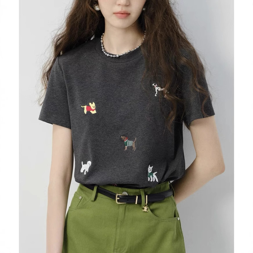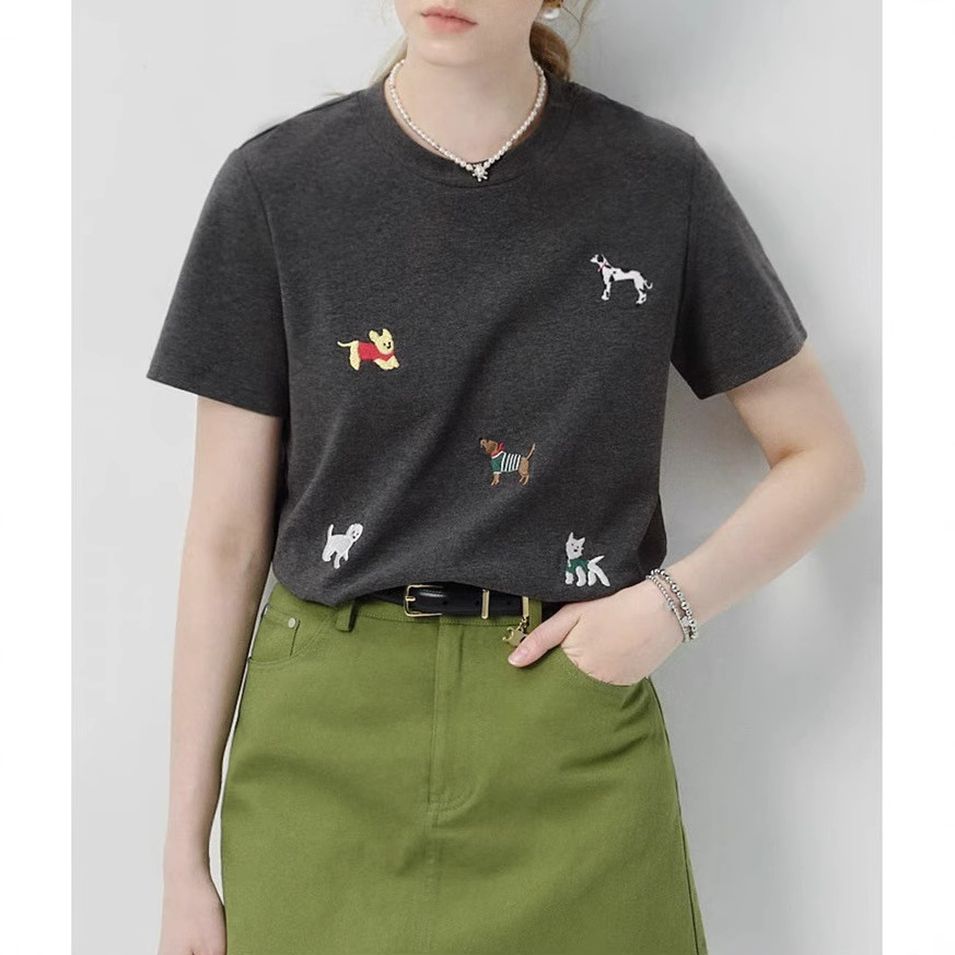 VEGA短袖T恤女2025新款夏季休闲简约趣味小狗刺绣正肩上衣