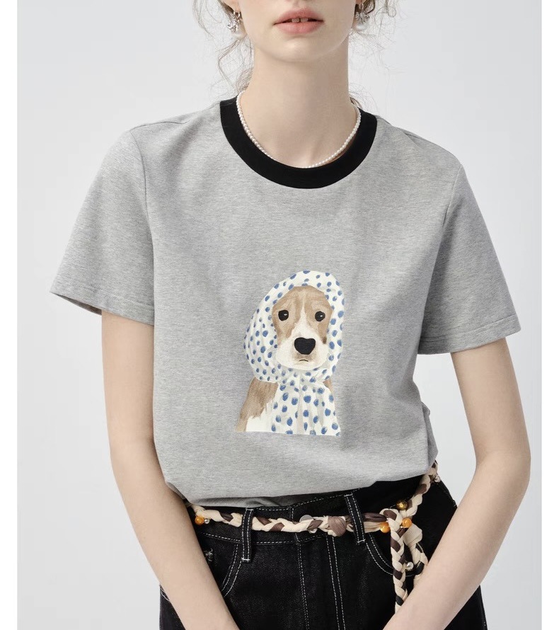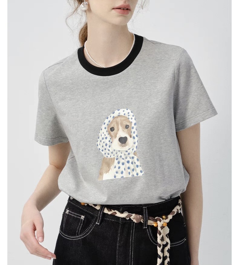 VEGA 短袖t恤女2025年夏新款宽松圆领休闲撞色小狗印花上衣