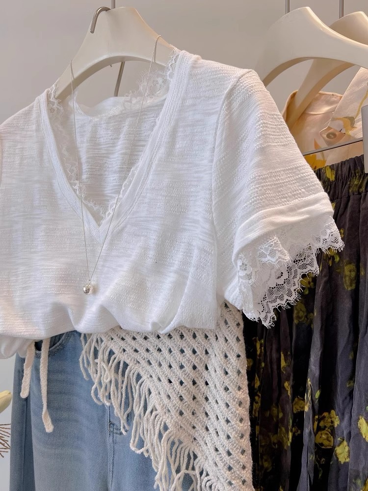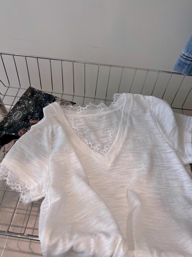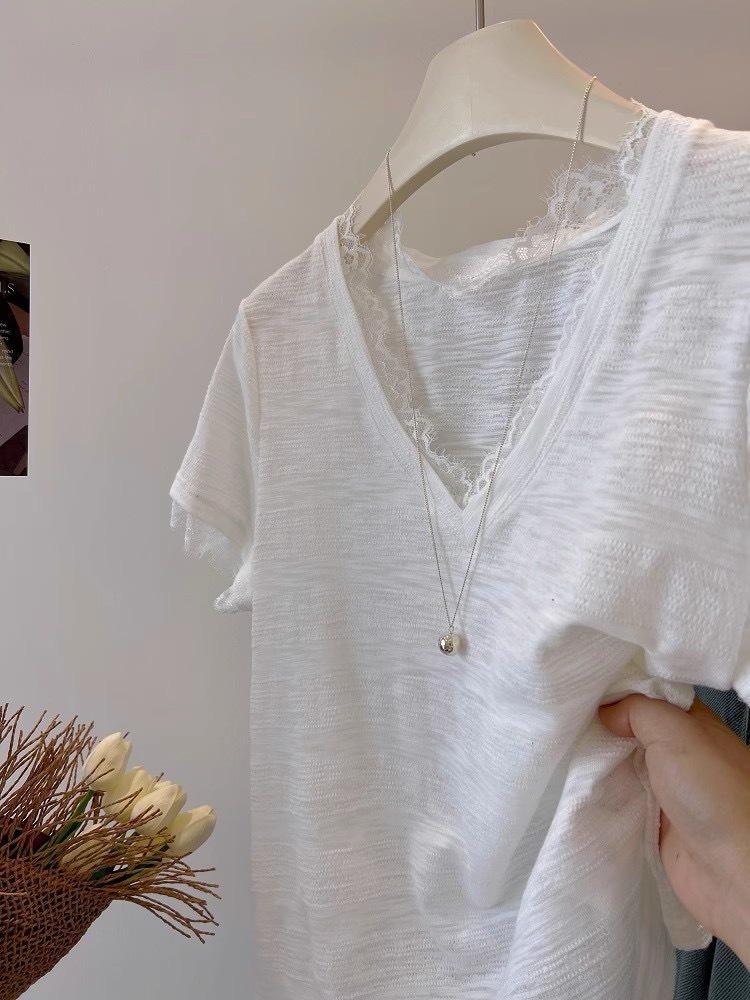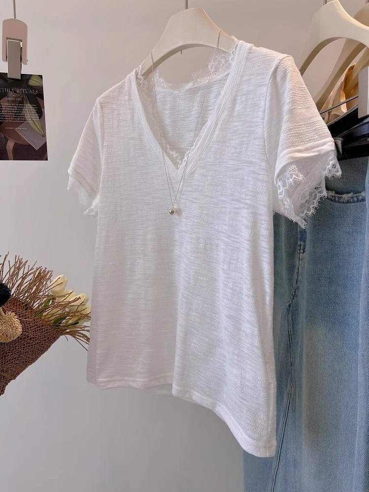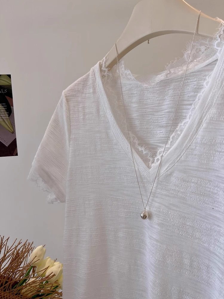 自留2件 太好穿 巨显瘦V领蕾丝花边竹节棉短袖T恤女tee