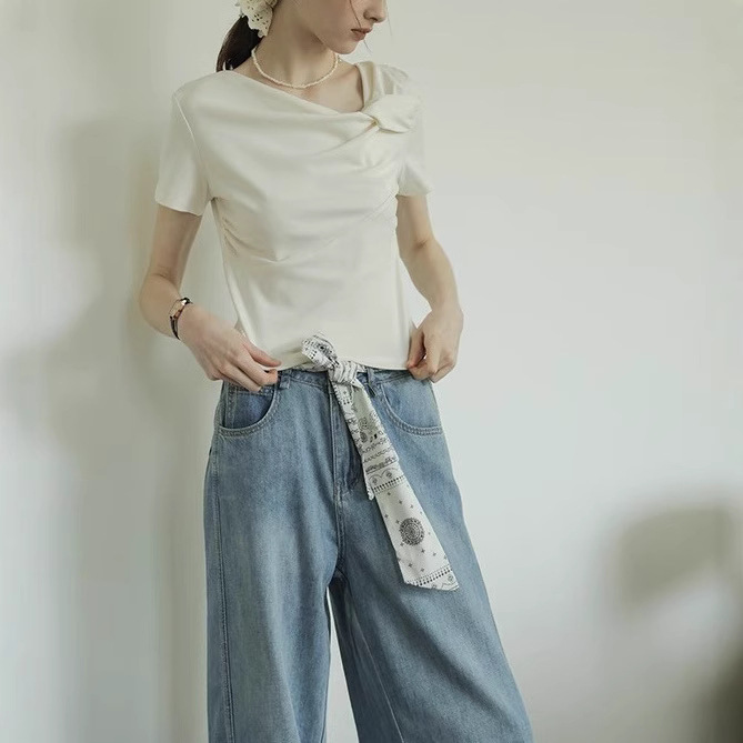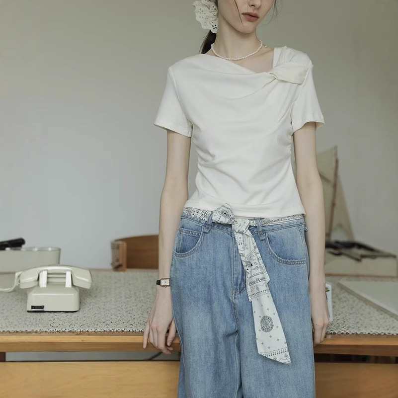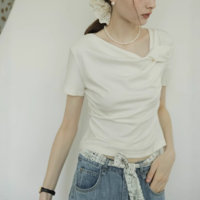 不对称纯色斜肩扭结短袖T恤女夏新款修身显瘦百搭休闲上衣