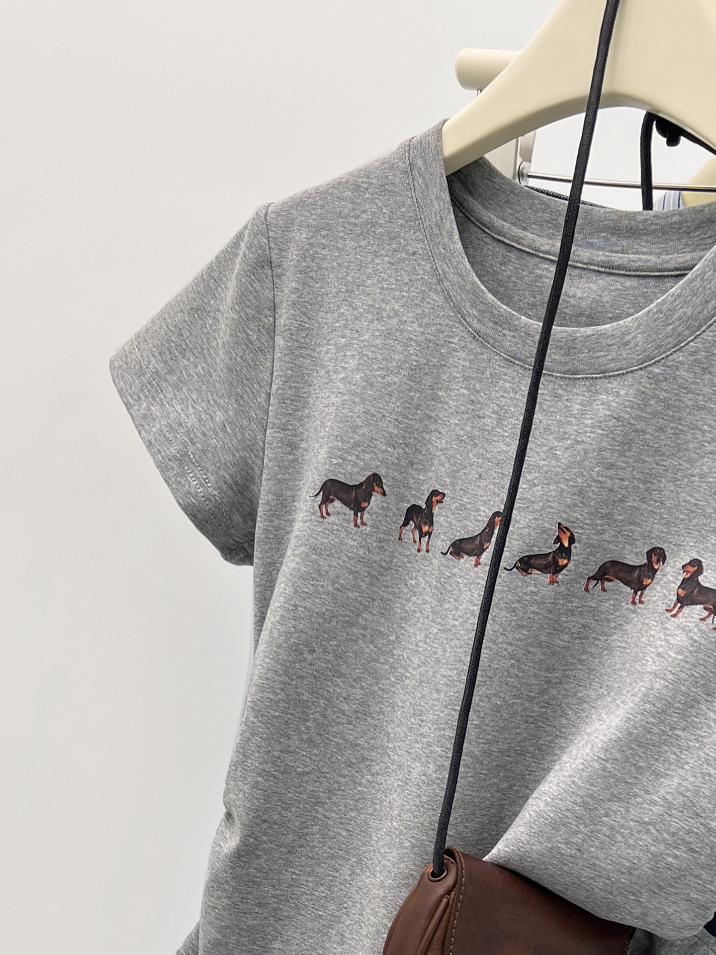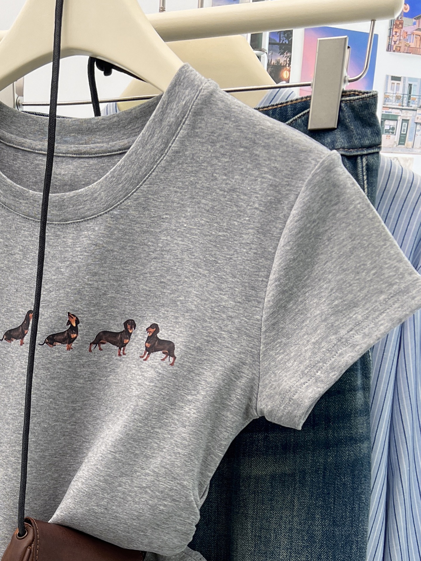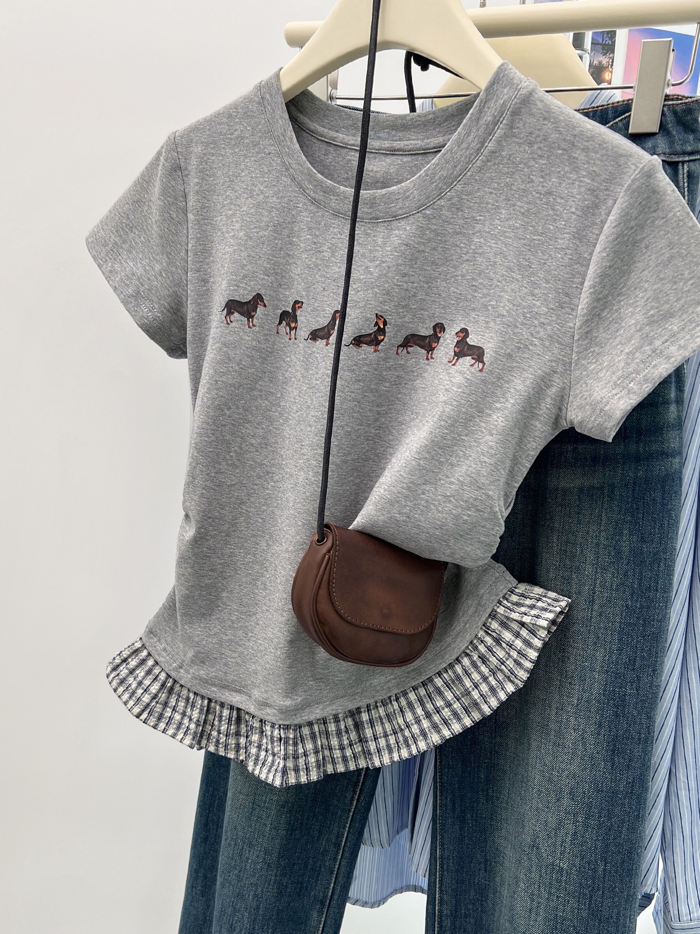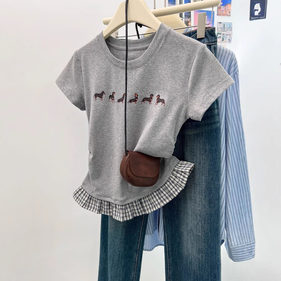 韩系夏女灰色ins小狗收腰花边正肩显瘦短袖T恤