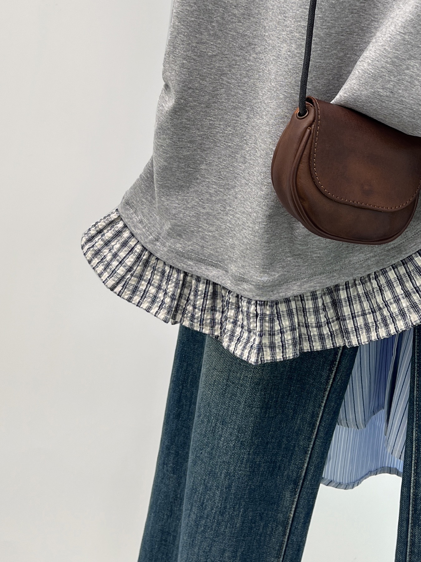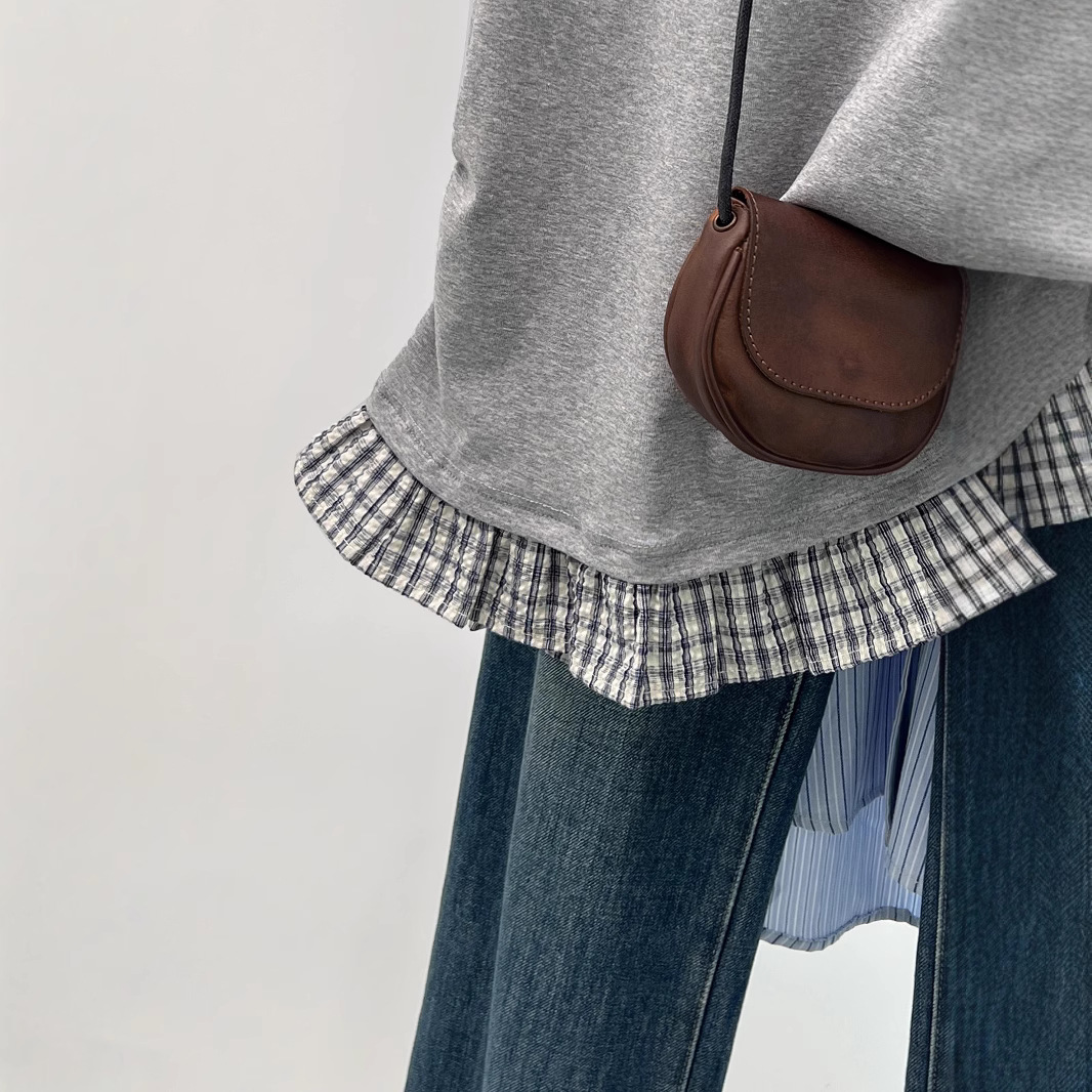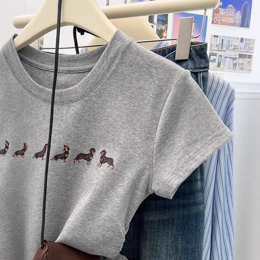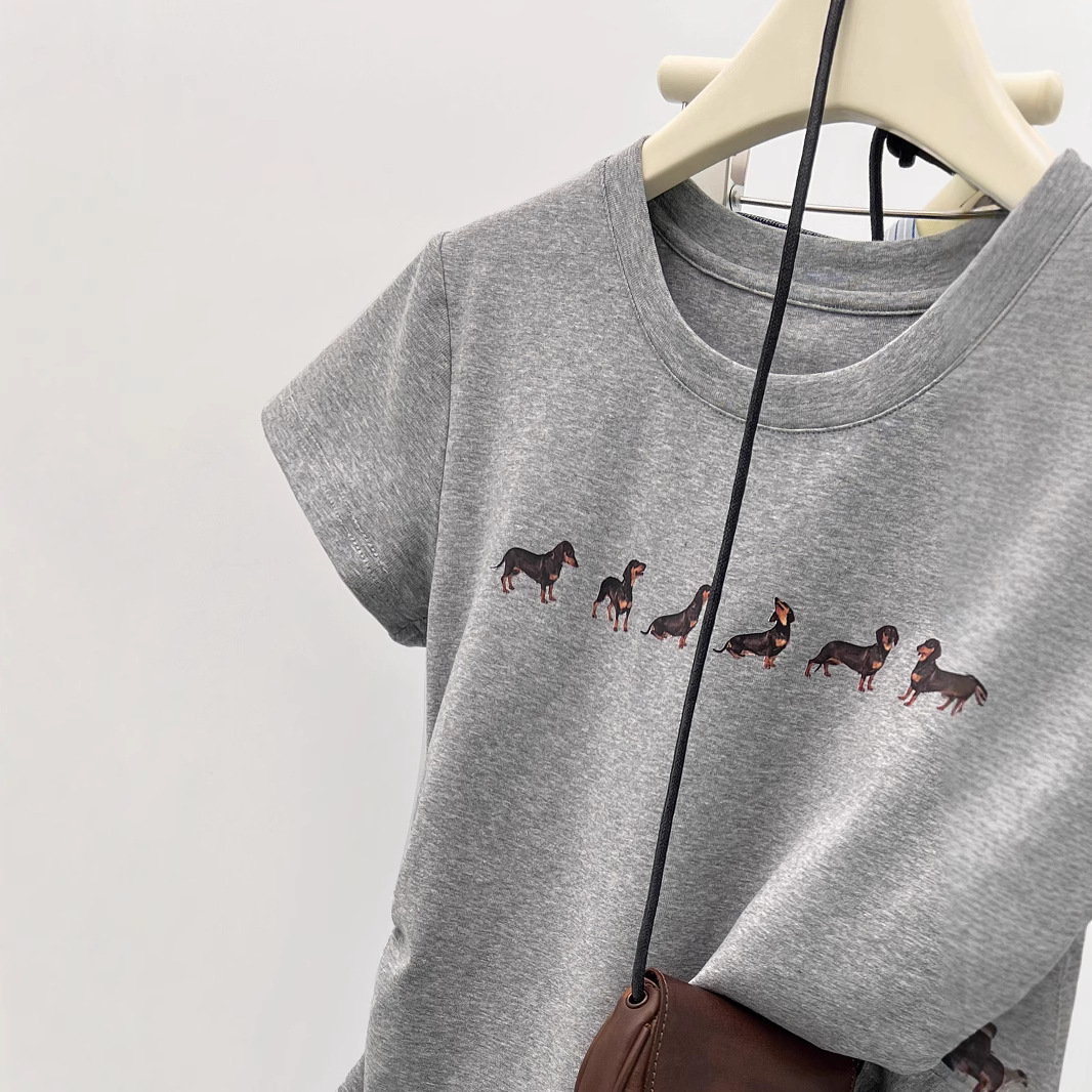 韩系夏女灰色ins小狗收腰花边正肩显瘦短袖T恤